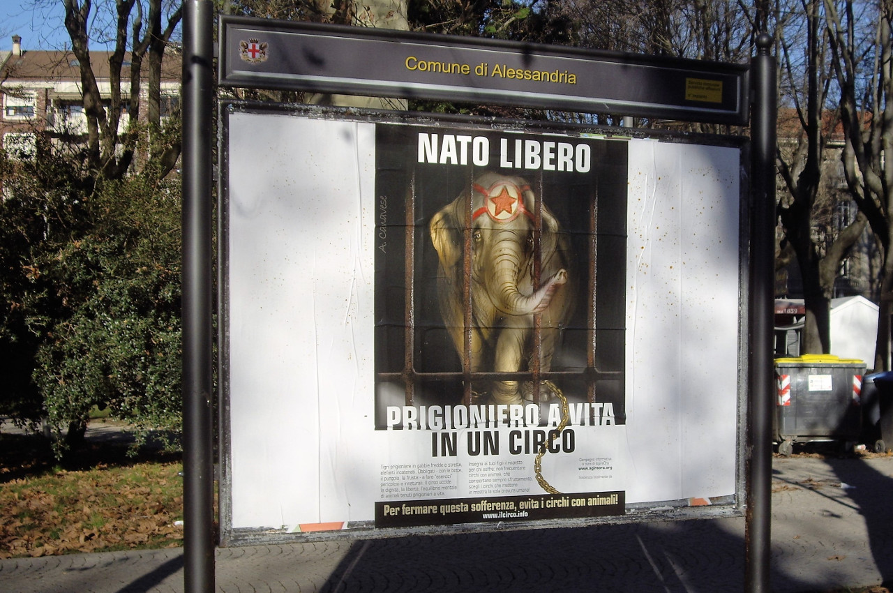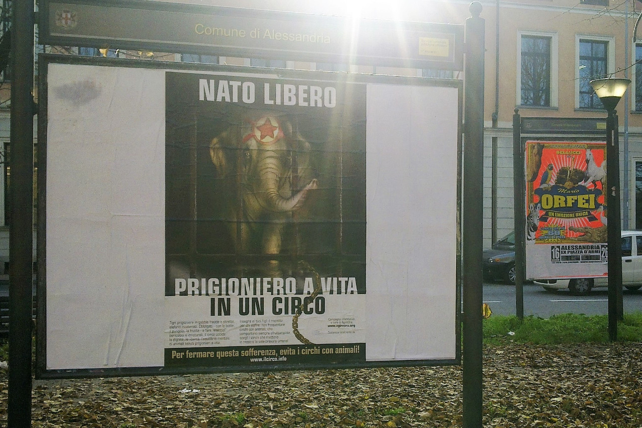 AgireOra Alessandria si è mobilitata in vari modi: in concomitanza all'arrivo del circo, sono ricomparsi anche quest'anno i manifesti "NATO LIBERO" che invitano i genitori a non portare i propri figli in quei circhi che utilizzano animali per gli spettacoli, obbligando così queste povere creature a una vita di schiavitù.