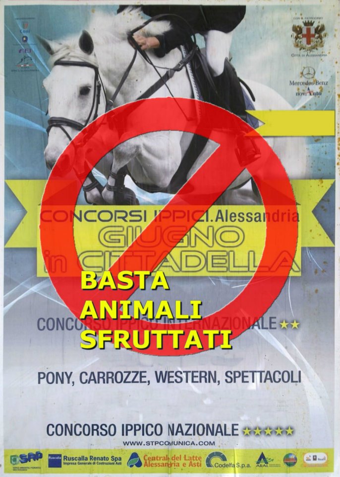 Cambiano le amministrazioni, ma per gli animali la "musica" è sempre la stessa e si continua a perseverare nella "tradizione" di patrocinare e magari sostenere logisticamente eventi che sfruttano gli animali, come appunto il Concorso Ippico. Anche quest'anno la Cittadella di Alessandria ha ospitato vari concorsi ippici (dall'8 al 10 giugno quello internazionale, dal 22 al 24 quello nazionale e dal 15 al 17 vari spettacoli con utilizzo di animali, carrozze, ecc.).