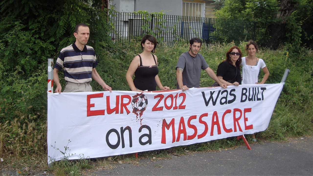 Oltre al dissenso nei confronti di questi eventi e al loro patrocinio, abbiamo dedicato uno striscione anche alle migliaia di cani randagi sterminati in Ucraina in occasione degli Europei di UEFA 2012, una strage silenziosa per "ripulire" le strade delle città dell’Ucraina in cui si giocano gli Europei di calcio, strage di cui pochissimi hanno dato notizia.
