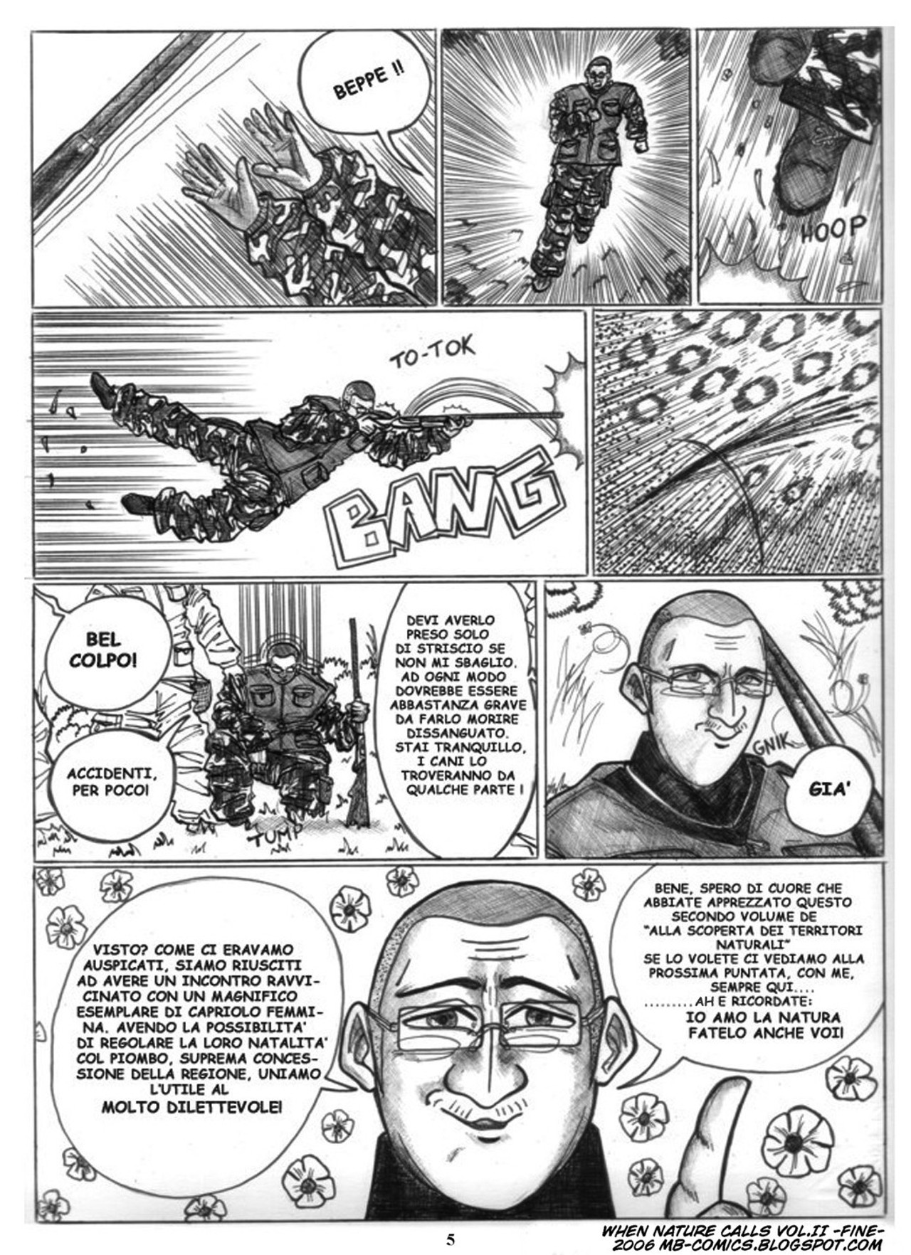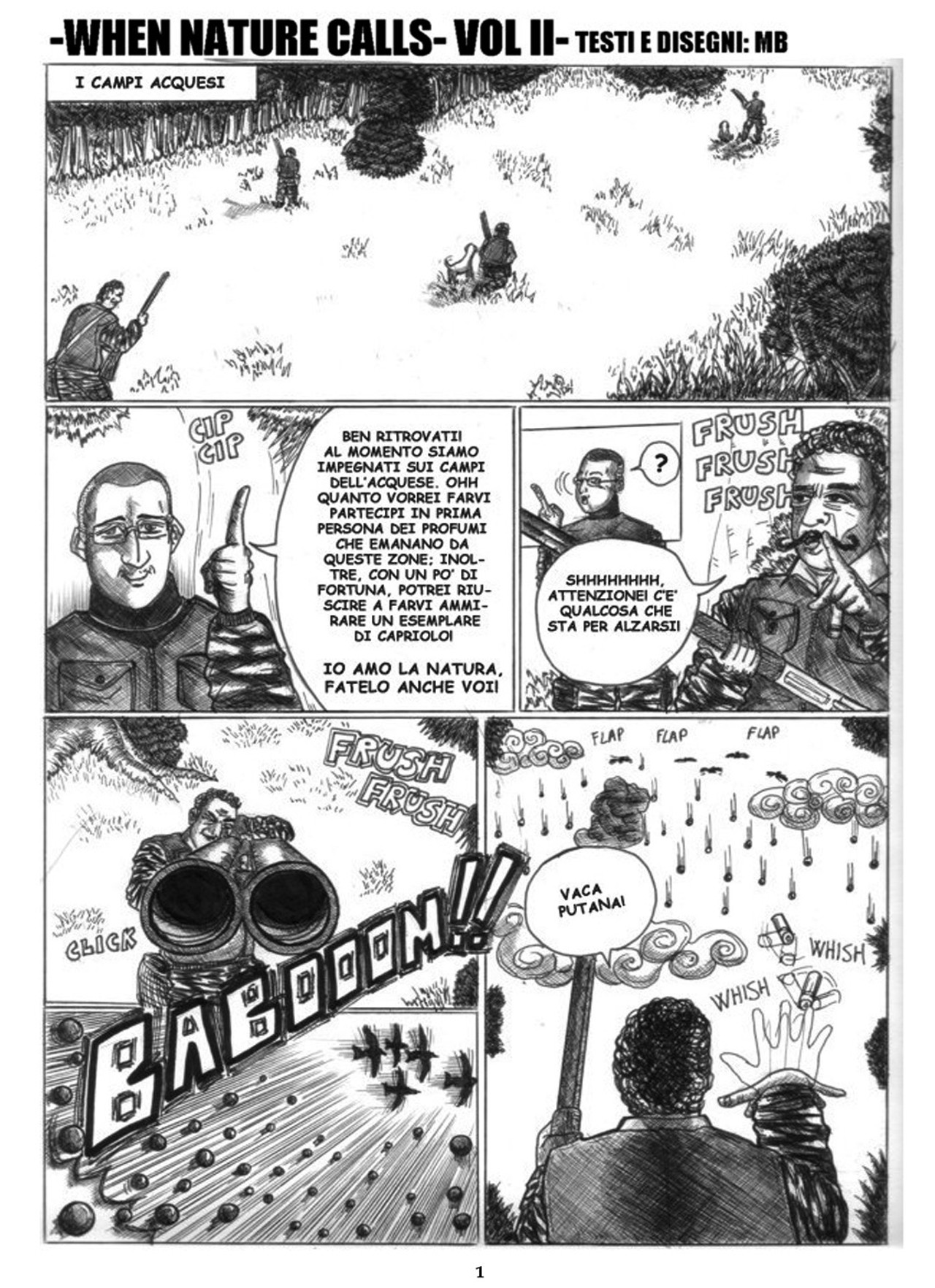 Matt J. Baner (Mattia Bianucci), che per passione crea fumetti, ci ha mandato questa storia in due parti (vol. 1 e vol. 2) di denuncia contro la caccia. Tratte da fatti reali, le due storie mostrano come si comportano i cacciatori della nostra provincia e come sia distorto il loro concetto di "amore per la natura". Purtroppo non si è inventato nulla e nemmeno ha esagerato, semplicemente ha riportato sotto forma di immagini e balloon, vari racconti di un suo conoscente cacciatore... Buona lettura.