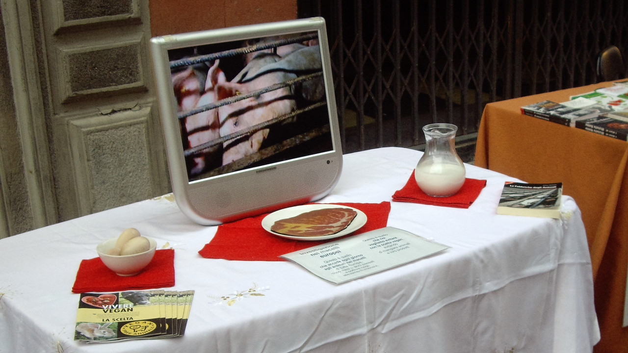 A lato del banchetto avevamo allestito anche un piccolo tavolo imbandito con una tovaglia delle feste e apparecchiato con una caraffa riempita con del latte (in realtà si trattava di latte di mandorla), una tazza con delle uova (in realtà erano di legno) e un piatto con un qualche taglio di carne (era un mouse-pad) e al centro della tavola un monitor collegato a un lettore dvd che mostrava a ciclo continuo ciò che subiscono gli animali negli allevamenti e nei macelli per soddisfare la richiesta di carne, latte e uova. Il filmato era "CARNE DA MACELLO - O ANIMALI DA SALVARE?"