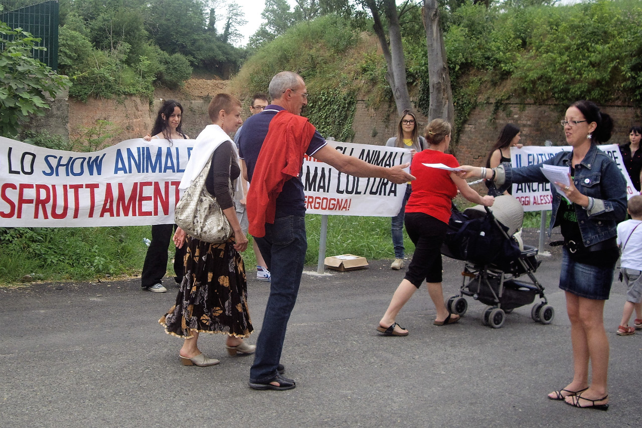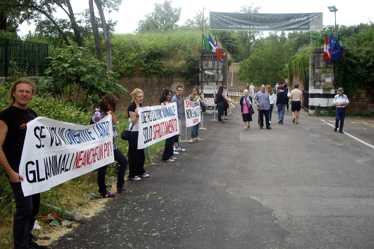Sabato 12 giugno dalle ore 19,00 alle 23,00 e domenica 13 giugno dalle ore 16,00 alle 19,00 gli attivisti hanno espresso il loro dissenso davanti l'ingresso in Via Pavia della fortezza, distribuendo migliaia di volantini ed esibendo degli striscioni. Abbiamo raccolto la solidarietà di molti, perfino di qualche allevatore di cavalli che riconosceva che il posto in cui un cavallo può vivere felice è libero in un campo, a brucare l'erba.