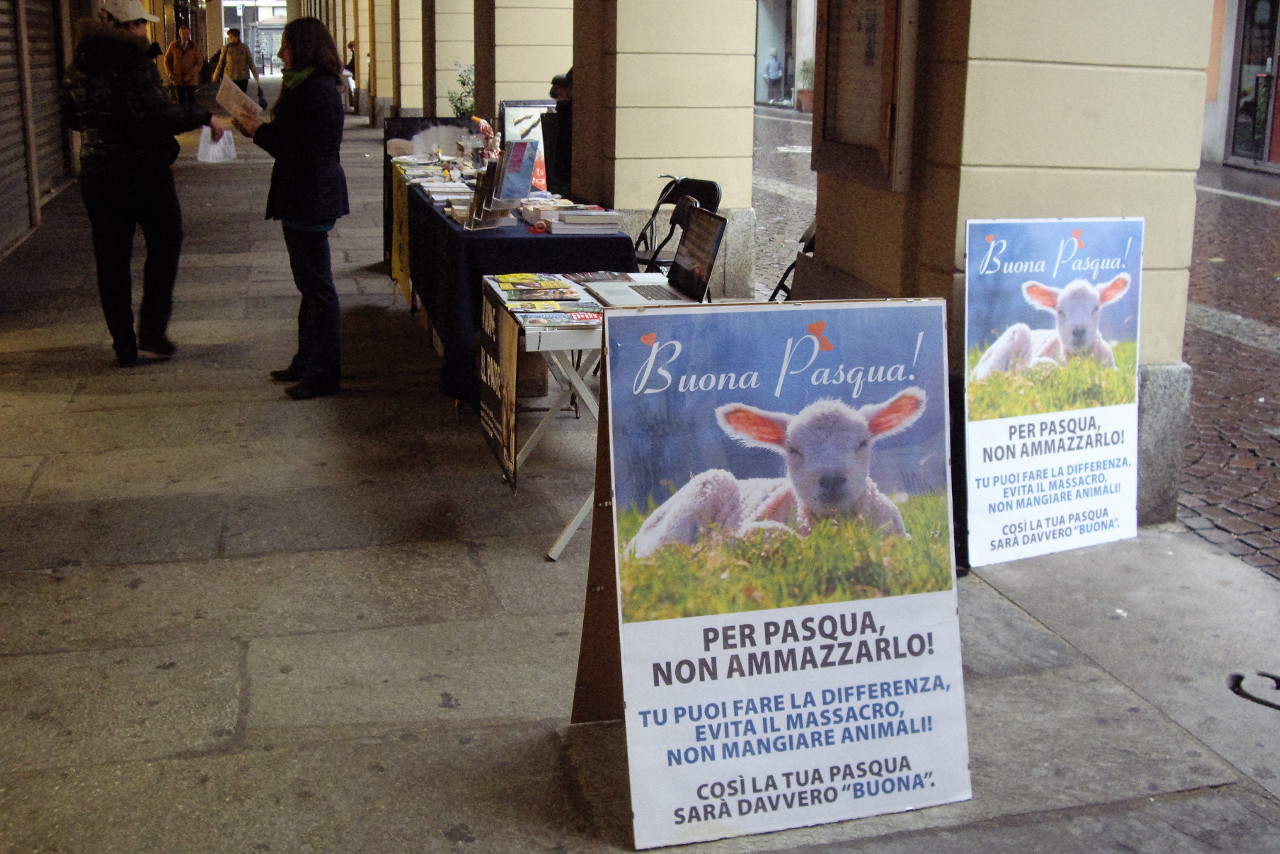 Banchetto informativo a Tortona di sensibilizzazione contro la strage degli agnelli (in particolare, e di tutti gli animali, in generale) consumata durante le festività pasquali.