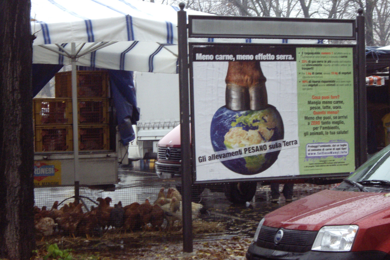 Nel manifesto della campagna informativa è ritratto lo zoccolo di un bovino che "schiaccia" il pianeta, con la spiegazione "Gli allevamenti PESANO sulla Terra", mentre il titolo asserisce "Meno carne, meno effetto serra".