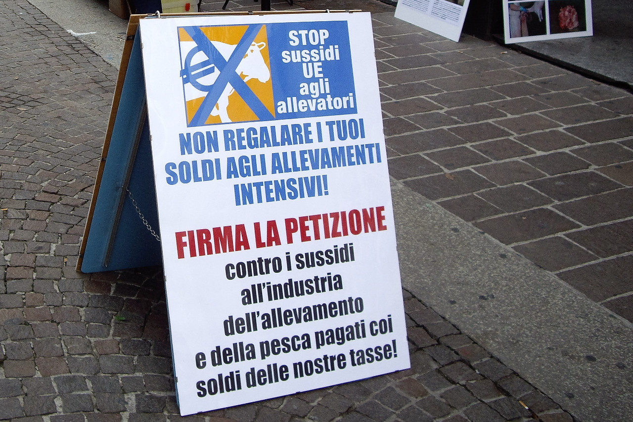 Campagna informativa a manifesti e petizione europea "Stop sussidi agli allevatori" consegnata alla Commissione Petizioni dell'Unione Europea.