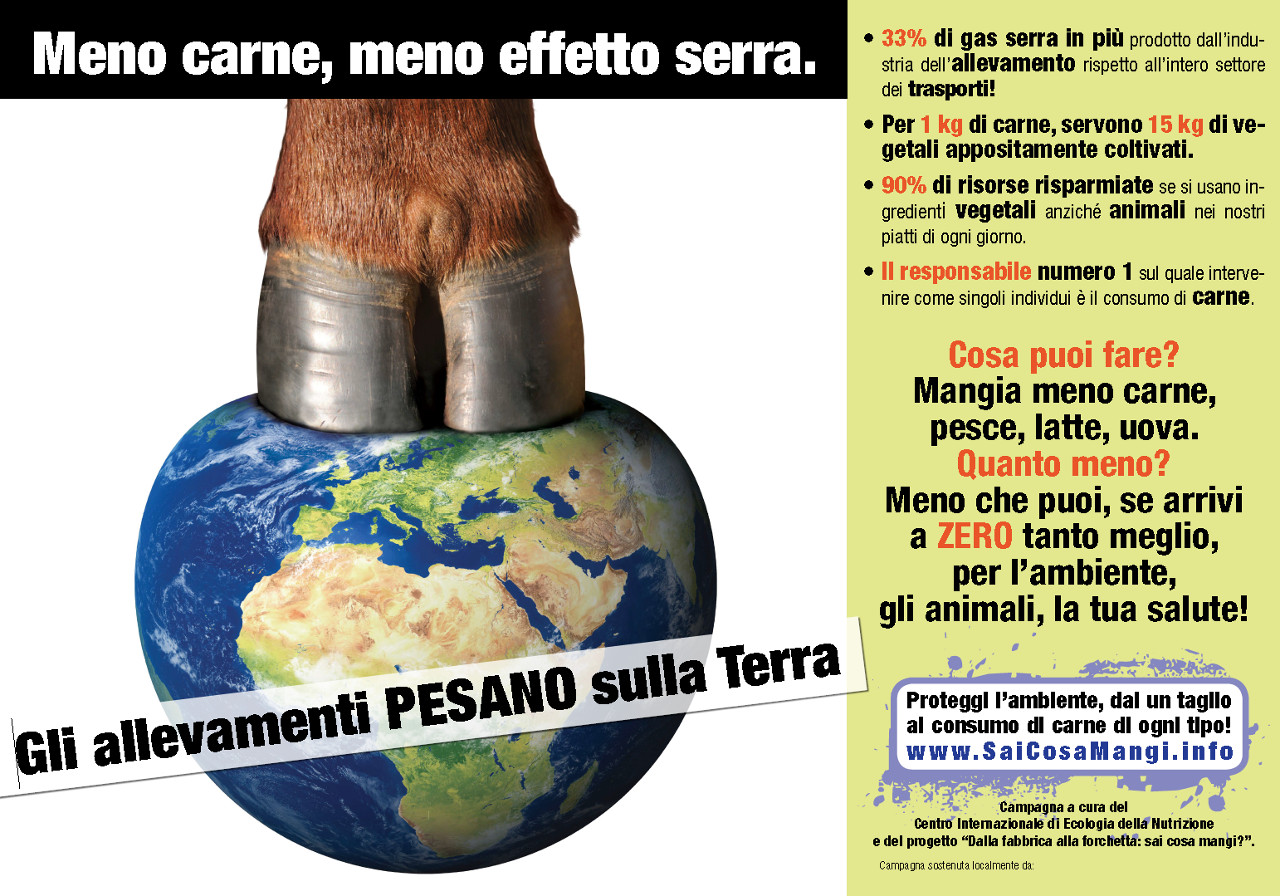 Sempre in tema dell'impatto ambientale degli allevamenti e la necessità di promuovere ufficialmente almeno una giornata settimanale veg, a partire dal 28 ottobre, per due settimane, ci sarà l'affissione del manifesto qui sotto raffigurato su stendardi bifacciali da 200x140 cm.