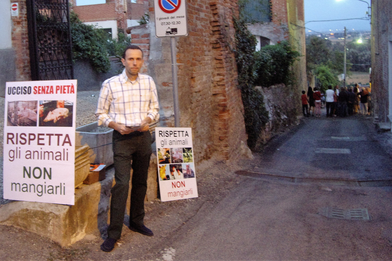 Non può esserci una vera festa se dietro c'è il macello, il sangue, le urla e tanta sofferenza di animali innocenti. Invece sì, c'è ancora molta indifferenza, da parte di tutti. Di chi organizza e degli sponsor che guardano solo al proprio tornaconto, di chi va a suonare, cantare e ballare e degli avidi avventori, tutti complici. Esponiamo dei cartelloni e distribuiamo dei volantini autoprodotti e fotocopiati vicino l'ingresso, con l'immagine della vittima di turno (asino o maiale) e la scritta "TU PAGHI... LUI MUORE".