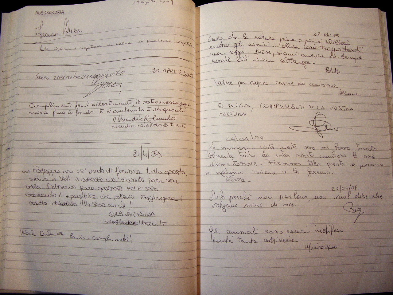 Ringraziamo tutti i 21 volontari che hanno permesso la riuscita di questa iniziativa, alternandosi instancabilmente durante tutta la durata della Fiera. Hanno fatto da guida ai visitatori e opera di informazione al tavolo informativo distribuendo centinaia di volantini e opuscoli sulla scelta vegan, oltre a numerosi libri. Sono tutti i volontari di AgireOra Alessandria e della sezione LAC di Alessandria, e molti di AgireOra Torino, oltre a Dora Grieco e Roberto Politi di Firenze, e Luigi De Benedictis di Lucca, di Progetto Vivere Vegan, che hanno creduto in questa esposizione, hanno portato fisicamente la mostra in Alessandria, l'hanno installata e infine disinstallata.