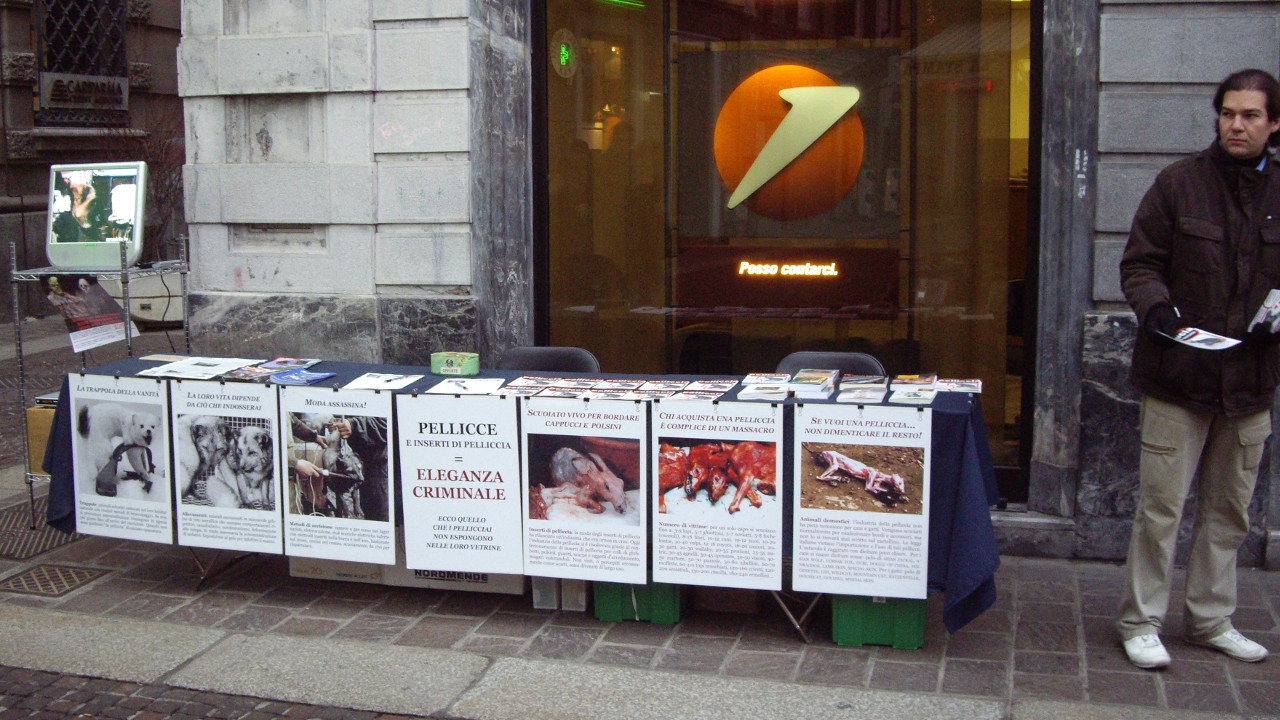Fissati davanti al banchetto anche alcuni pannelli descrittivi, ma ciò che ha attirato di più l'attenzione erano i filmati provenienti da investigazioni all'interno di allevamenti cinesi, dove procioni e cani vengono tramortiti e letteralmente scuoiati ancora vivi e coscienti, tra urla e guaiti. Un video molto duro da vedere, che ha suscitato sdegno in molti attirati dai guaiti strazianti degli animali.