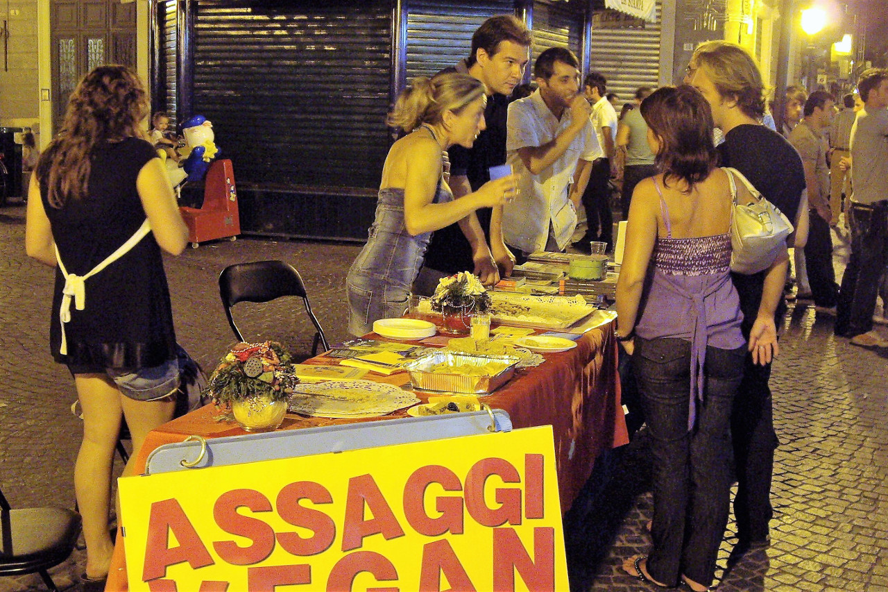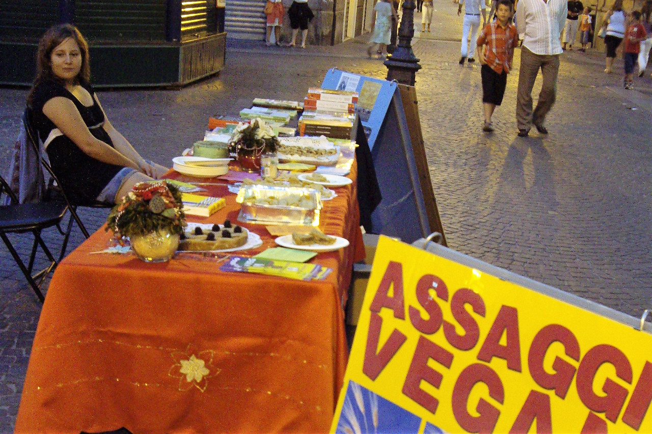 Verso le otto di sera abbiamo iniziato a offrire gli assaggi vegan, ma ci siano resi conto che conveniva iniziare prima, perché a quell'ora non c'era quasi più nessuno in giro.