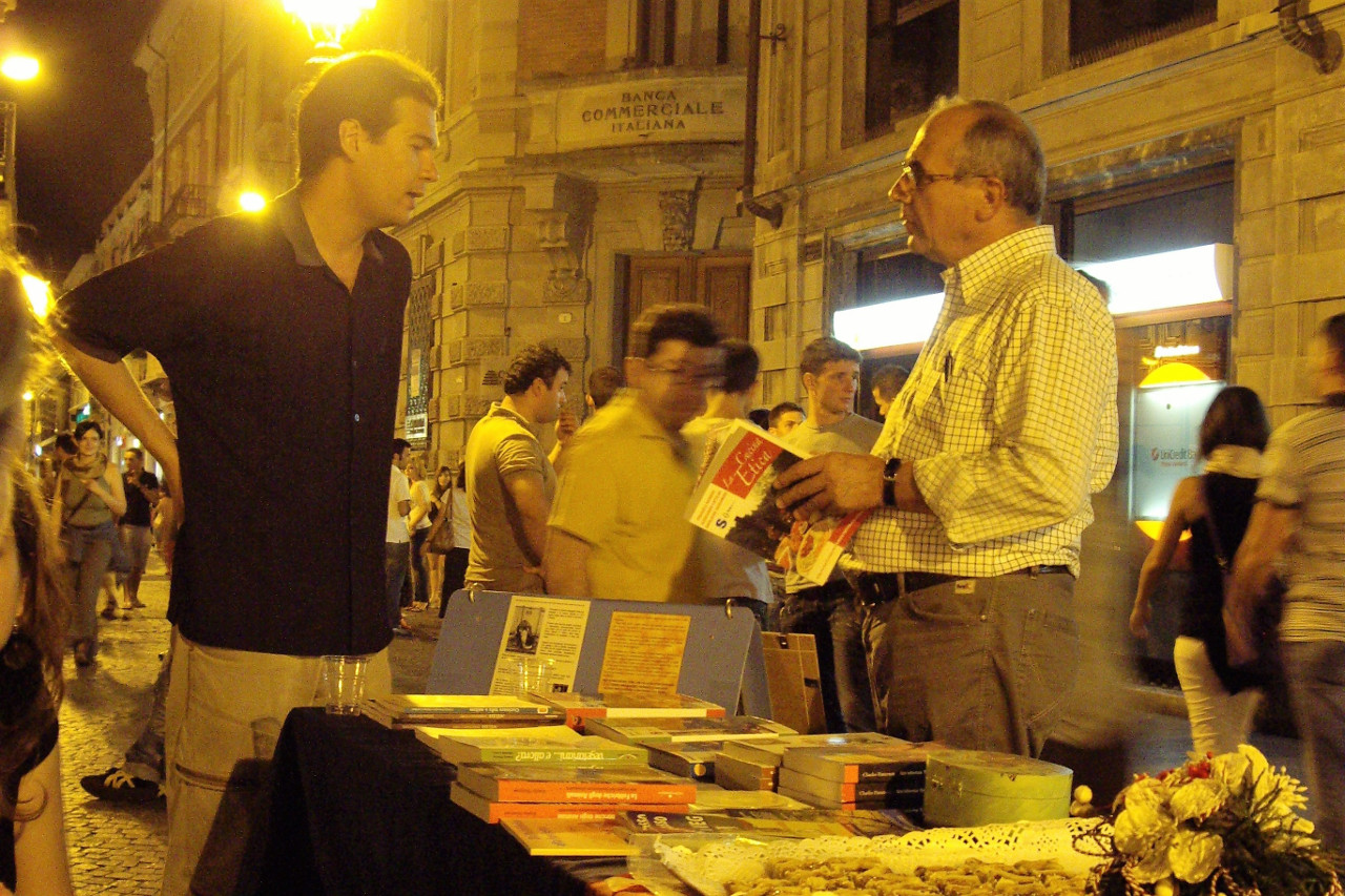 Un signore, con un tipico accento toscano (e tipica simpatia), guardando le ricette ha chiesto cosa fossero il seitan e il tofu. Alla fine ha preso il libro "La cucina etica" di Edizioni Sonda, dimostrando interesse (interesse nel farsi preparare in casa qualche piatto da sua moglie).