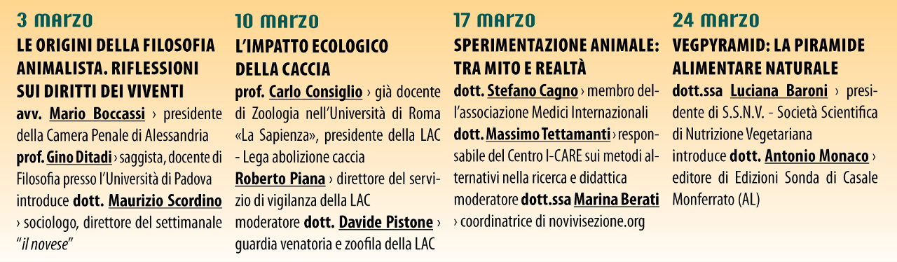 Il ciclo di conferenze "Animali e Umani" di quest'anno ha introdotto qualche modifica nella impostazione rispetto gli anni passati, per conferire agli incontri maggiore risonanza e prestigio. Gli incontri si sono svolti presso un importante centro congressi di Alessandria, la sede dell'associazione Cultura e Sviluppo, nei primi quattro sabati di marzo in orario pomeridiano. Le conferenze erano strutturate per avere due relatori più un moderatore. Tra i relatori designati non hanno potuto partecipare Gino Ditadi e Massimo Tettamanti.