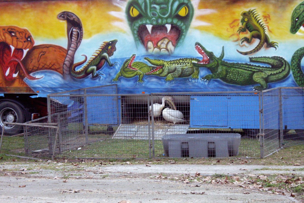 Le condizioni in cui sono tenuti questi animali erano a di poco precarie: abbiamo visto dei pellicani in un vano sotto un camion, un ippopotamo (!) in un piccolo recinto con una misera pozza d'acqua, un'aquila reale legata a un arco metallico piantato in terra, una coppia di istrici in una minuscola gabbia che parevano impazzite perché continuavano a girare vorticosamente su loro stesse...