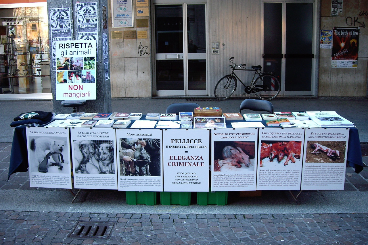 In quanto senzienti, gli animali sono portatori di diritti che non possono reclamare, sopraffatti da una umanità che domina, sfrutta, abusa, viviseziona, addestra, esibisce, schiavizza, alleva, caccia, pesca, mangia, abbandona, sevizia, tortura, spenna e scuoia. Il banchetto era dedicato in particolare alle pellicce, considerato il periodo, esibendo sul davanti una mostra fotografica. Abbiamo distribuito materiale informativo per cambiare le nostre abitudini, per la salvezza di milioni di animali.