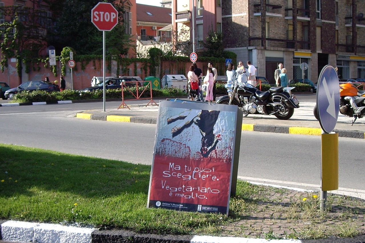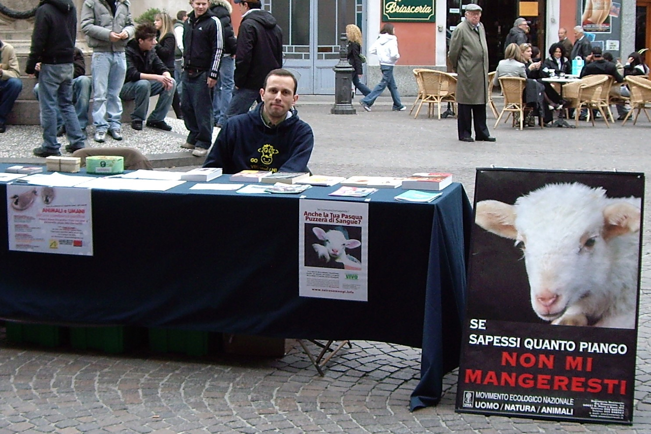 Sabato 15 aprile invece abbiamo organizzato anche un banchetto informativo con annessa una mostra sulla scelta vegan in Piazzetta della Lega, oltre che per parlare ancora una volta della crudele tradizione dell'agnello di Pasqua, anche e soprattutto contro ogni forma di allevamento, invitando a boicottare la mostra zootecnica della Fiera di San Giorgio.