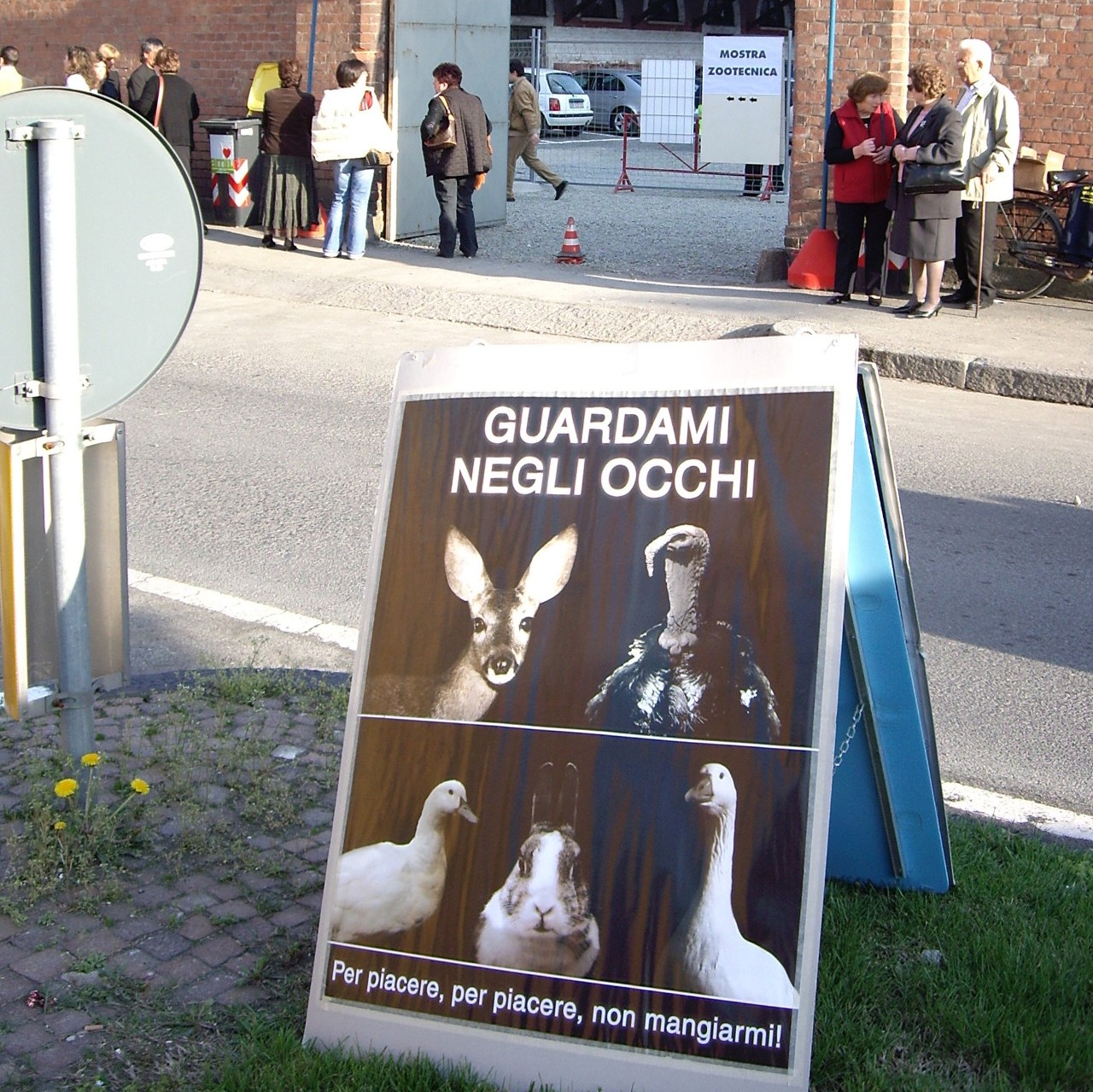 Scopo della nostra iniziativa è di sensibilizzare le persone sulla sofferenza e la morte degli animali d'allevamento messi in mostra all'interno della Fiera con distribuzione di volantini ed esposizione di cartelli e striscioni che invitano alla scelta vegan.