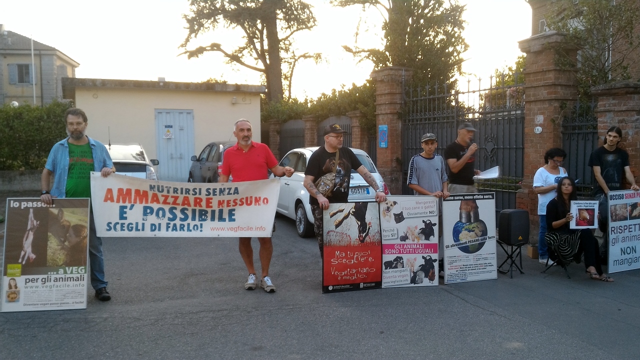 Ci duole constatare quanto sia ancora tenace e radicata in parte della popolazione un'ingiustificabile indifferenza nei confronti della sofferenza degli animali. È tempo che scompaia ogni incivile usanza di banchettare con i corpi straziati di innocenti condannati a morte dalla crudeltà e dalla bramosia umana di profitto. Sabato 19 agosto abbiamo organizzato un presidio di protesta di fronte l'ingresso della sagra.