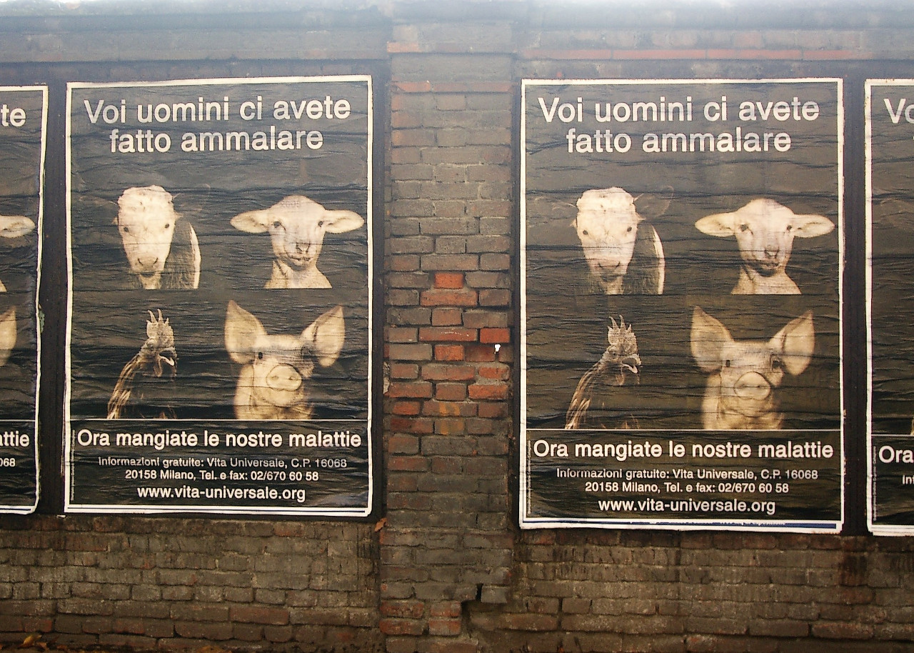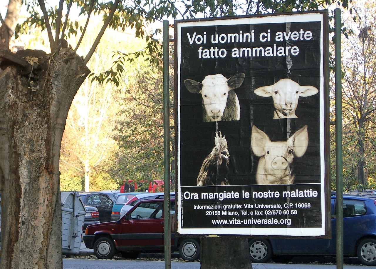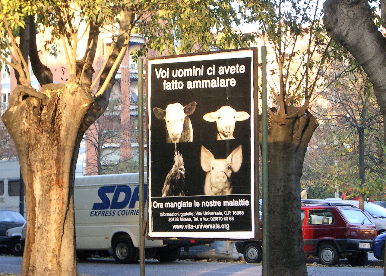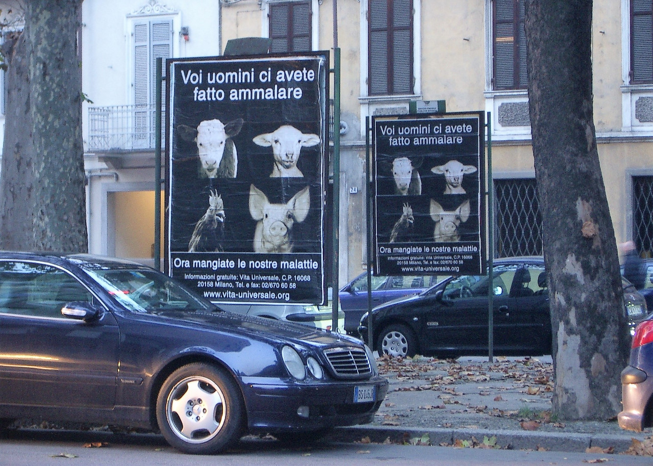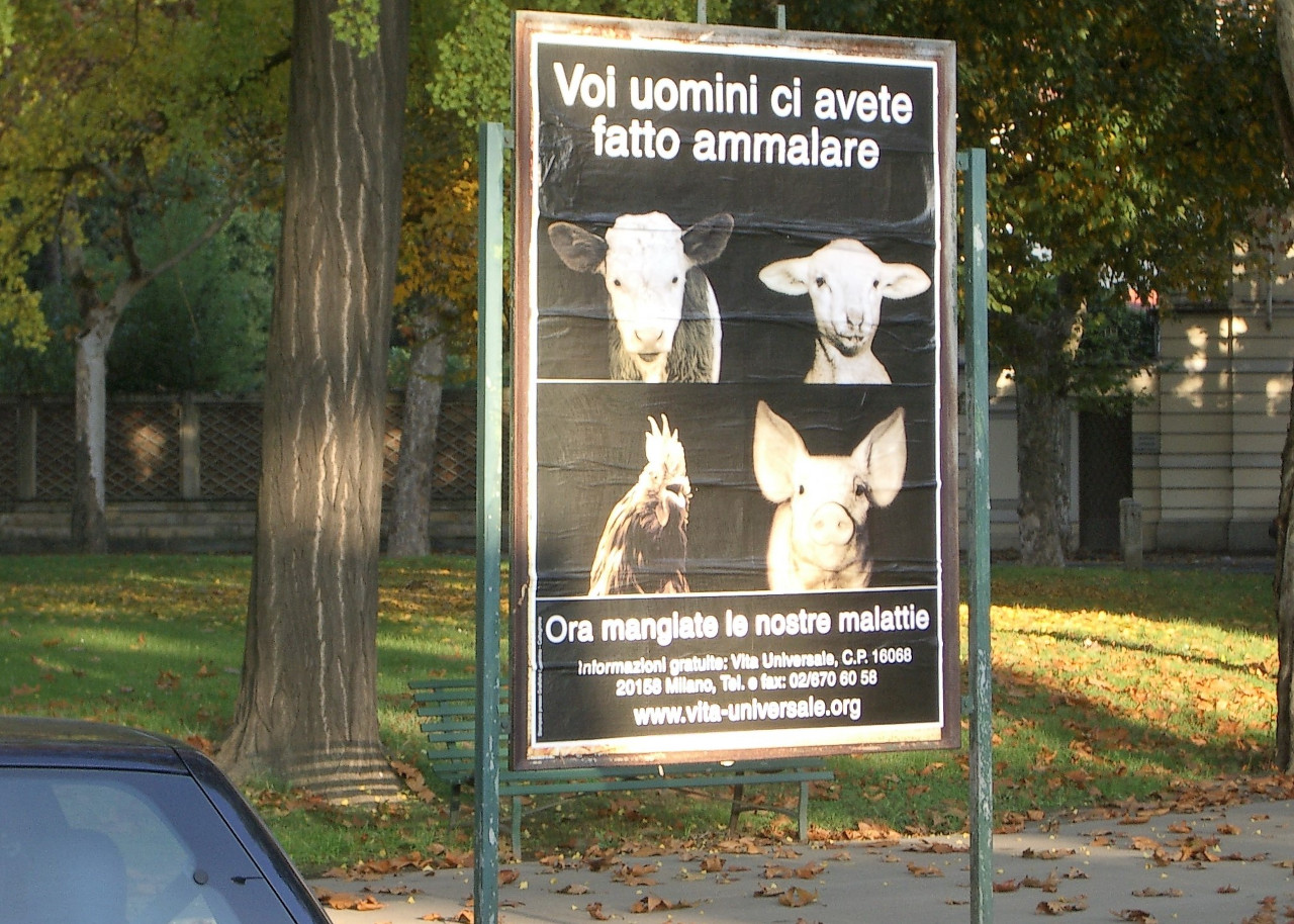 Prima la mucca pazza, poi il morbo delle pecore, ora l’influenza aviaria... Gli allevamenti intensivi continuano a produrre effetti devastanti non solo per gli animali, e l’associazione “Vita Universale” lo evidenzia in modo eloquente con un manifesto che abbiamo fatto esporre in diversi angoli di Alessandria: "Voi uomini ci avete fatto ammalare. Ora mangiate le nostre malattie". La campagna di sensibilizzazione è nazionale, e contemporaneamente si svolge in tante altre città.
