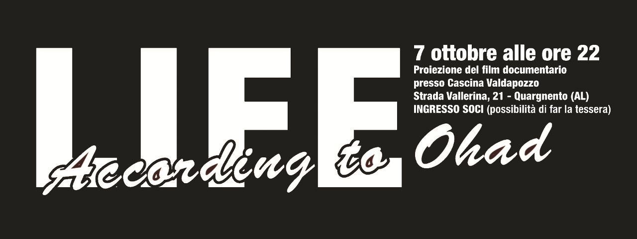 Sabato 7 ottobre tutto il giorno fino alle ore 18,00 saremo con un banchetto informativo vegan presso la "Fiera del G.A.S." di Tortona, in Via Emilia. Ancora sabato 7 ottobre alle ore 22,00 presso Cascina Valdapozzo, Strada Vallerina 21, Quargnento (AL), proporremo la visione del film-documentario di Eri Daniel Erlich "LIFE ACCORDING TO OHAD" (Israele, 2014). È la storia di un giovane attivista per i diritti animali di Tel Aviv e del suo tentativo di ricongiungersi con la propria famiglia da cui si è distaccato da molti anni e far conoscere il suo mondo. L'iniziativa rientra nelle stagione autunnale di spettacoli dell'associazione culturale Valdapozzo. L'ingresso è riservato ai soci ma ci si può iscrivere sul momento.