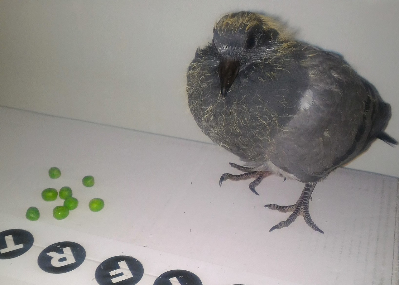 Nessuna lesione esterna, sotto le ali, alle zampe, in bocca. Le feci erano compatte e regolari. Il piccolino era in buona salute, ben nutrito e dall'occhio vispo. Poteva avere sì e no una ventina di giorni. Per i primi giorni è stato imbeccato tre volte al giorno con qualche pisello fresco e una miscela di mais spezzato e grano rammollito in acqua tiepida. Poi lo si è osservato mangiare da solo la stessa miscela secca.