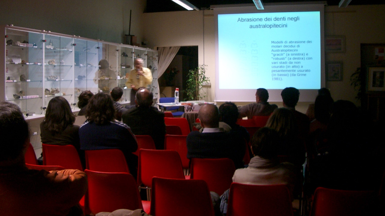 Nella seconda parte della conferenza, Consiglio ha esaminato gli adattamenti della nostra specie. Gli adattamenti più interessanti dell’uomo sono quelli relativi ai denti. Noi abbiamo un'arcata dentaria ampia e parabolica e i denti sono sotto al cranio, non davanti, come in un cane o anche in un babbuino. In altre parole abbiamo la faccia piatta, non abbiamo un muso che sporge. Questo è un adattamento a mangiare cibi duri perché rende più efficace lo sforzo per triturare il cibo, che sarebbe molto meno efficace se la mandibola e la mascella fossero lunghe. Tutti gli Australopiteci possiedono piccoli incisivi che contrastano con i grandi molari. Dovevano quindi essere prevalentemente folivori. L'uomo ha lo smalto più spesso di tutte le scimmie antropomorfe. Questa è un'altra indicazione sulla sua dieta originaria a base di cibi duri, come semi.