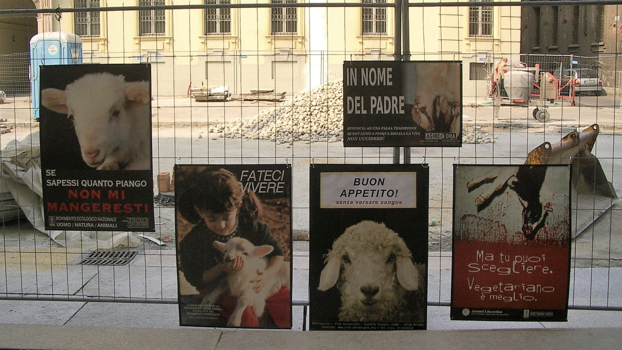 In occasione delle festività pasquali abbiamo effettuato ad Alessandria un'affissione di manifesti dell'associazione Vita Universale con il primo piano di un agnello e la scritta "Guardami negli occhi. Per piacere, per piacere, non mangiarmi". La domenica delle Palme abbiamo distribuito davanti la Cattedrale 300 volantini con un menù pasquale 100% vegan.