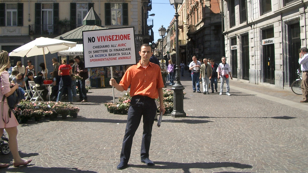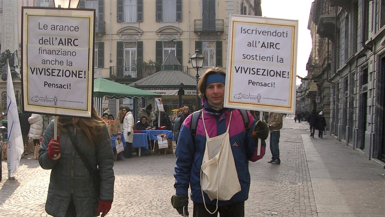 In tutte le piazze italiane il 29 gennaio e l'8 maggio, l'AIRC (Associazione Italiana per la Ricerca sul Cancro) ha venduto le "Arance della salute" e le "Azalee della ricerca" allo scopo di sostenere la sua ricerca medica. In Alessandria entrambe le iniziative si sono svolte di mattina in Piazzetta della Lega. A pochi passi dal loro gazebo, tenendo in mano alcuni cartelli e volantinando, abbiamo informato le persone che si recavano al banchetto AIRC di quello che AIRC stessa non dice, e cioè che una parte delle donazioni fatte a questa associazione va a finanziare esperimenti su animali.