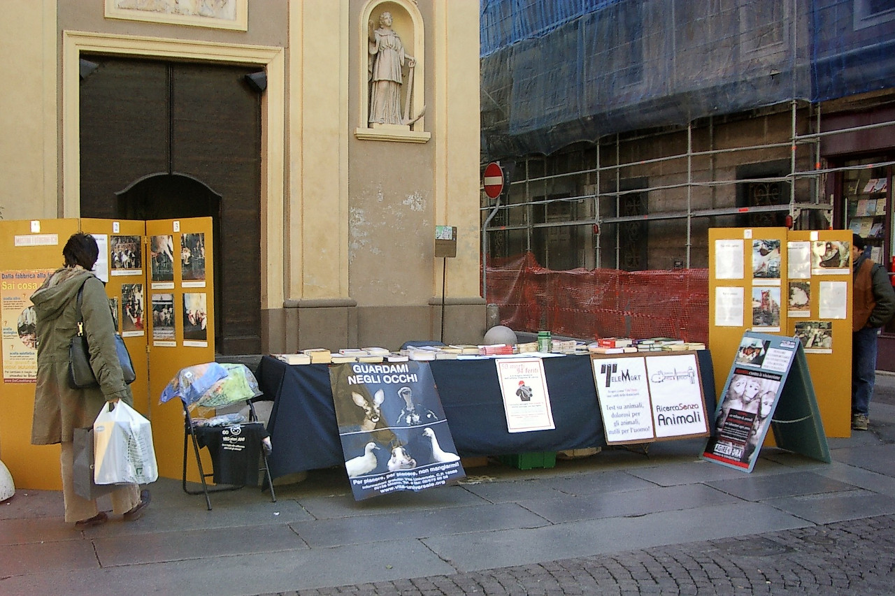 Sabato 18 dicembre pomeriggio, davanti la Chiesa di San Giovannino in Corso Roma ad Alessandria, abbiamo organizzato un banchetto informativo su varie tematiche animaliste: una mostra sulla scelta vegan, contro la caccia con una petizione promossa da "Caccia il Cacciatore" e contro la vivisezione attraverso la campagna "Ricerca senza animali", informando le persone che donando a Telethon si finanziano un gran numero di ricerche che coinvolgono animali.
