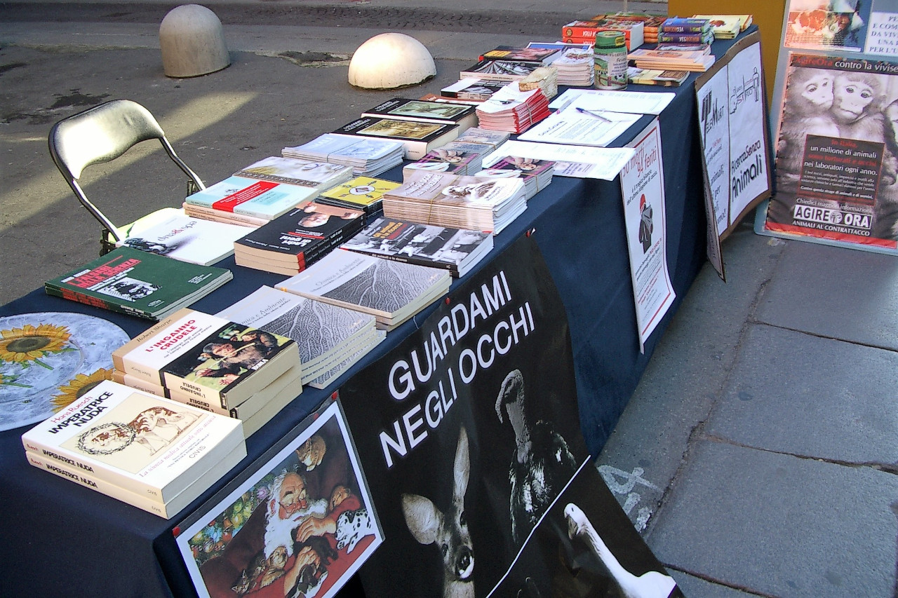 Oltre a questo, sul nostro banchetto, tantissimi materiali informativi, come opuscoli, cd e libri su vari argomenti, in particolare sulla filosofia antispecista come l'importante e documentatissima opera in due tomi "I filosofi e gli animali", a cura di Gino Ditadi (Isonomia Editrice). E anche gadgets in découpage per aiutarci a sostenere le nostre iniziative.