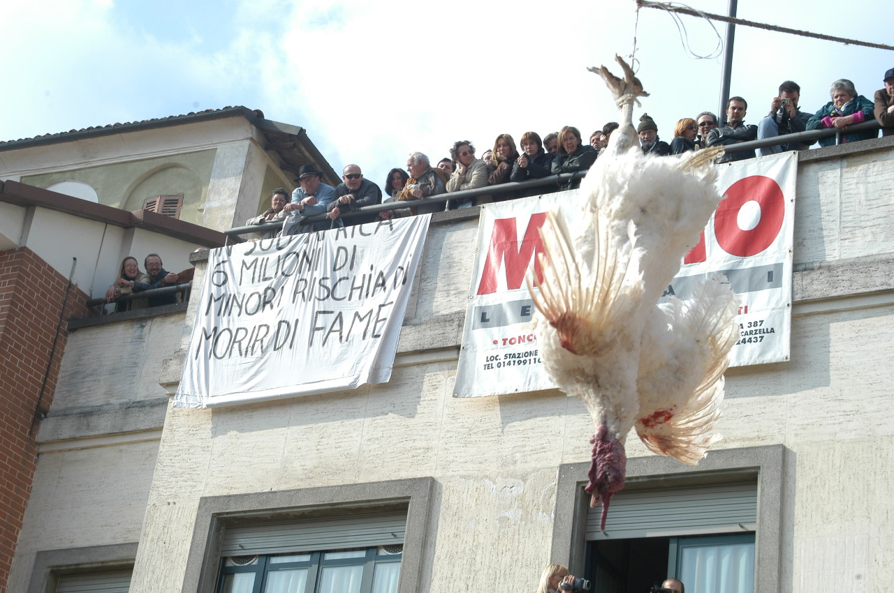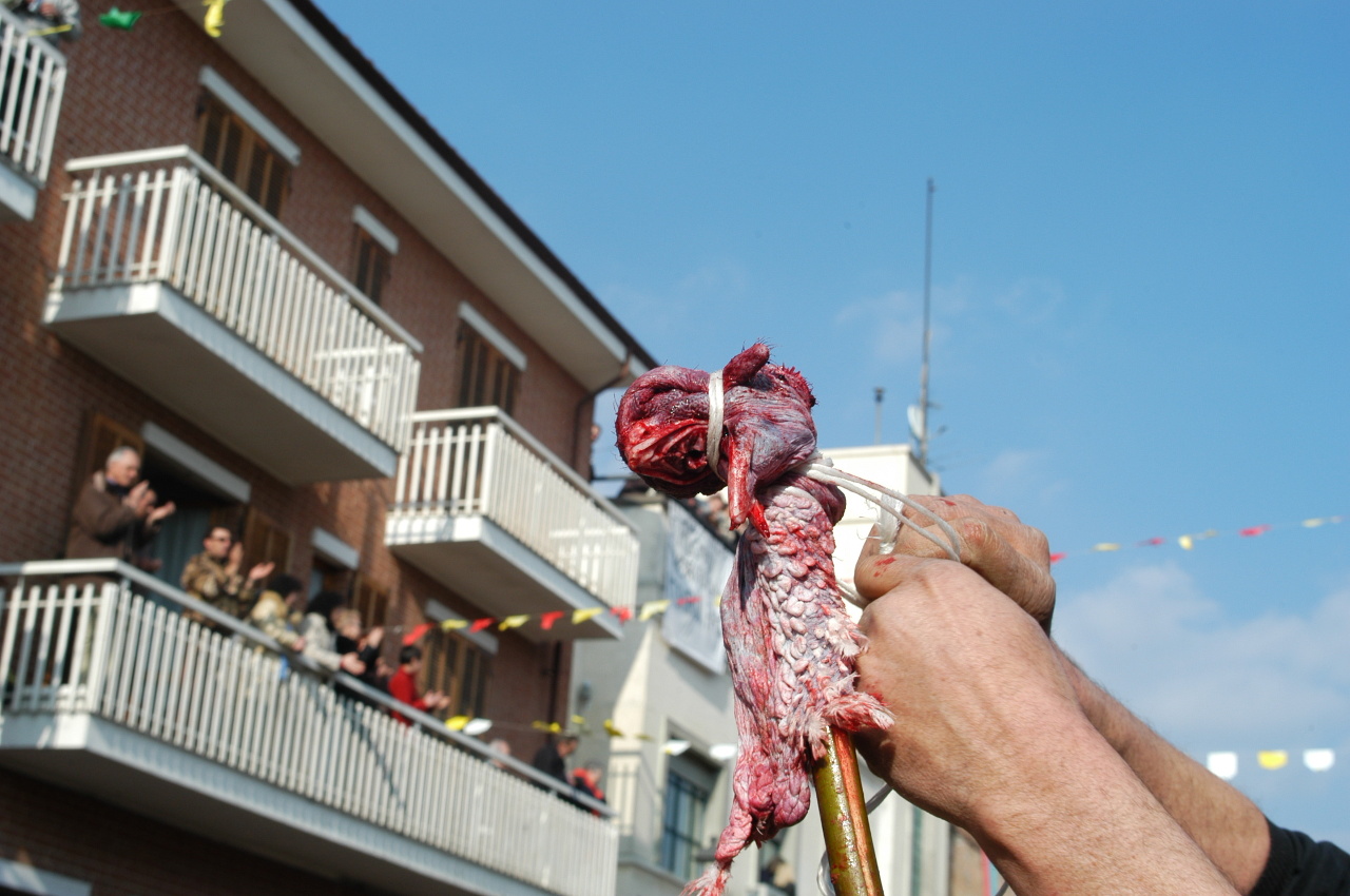 La gara viene sospesa un paio di volte per far scendere il tacchino e "segargli" un po' il collo con un seghetto, visto che i colpi inferti non bastano per staccarne la testa. Quindi viene di nuovo issato in alto e la gara riprende. Ormai è il delirio, nessuno vede l'animale martoriato, il vilipendio su un cadavere. Infine la testa si stacca. Il popolo eccitato corre a prenderla e la issa come un trofeo sul bastone del vincitore. Gli animalisti non hanno quasi più voce, ma urlano ancora "VERGOGNA! VERGOGNA! VERGOGNA!"