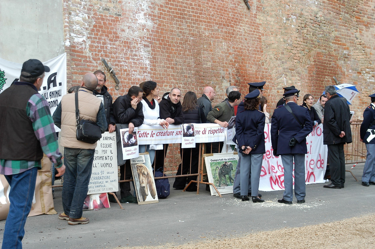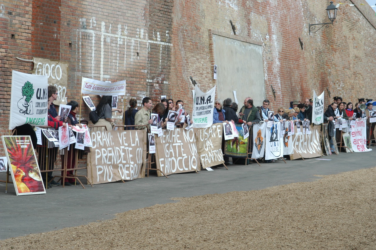 Inizia quindi la giostra equestre fra le urla di incoraggiamento o i motteggi dei borghigiani da una parte e le urla di protesta degli animalisti dall'altra, che vorrebbero entrare nella pista e bloccare la gara. Ma in questa occasione non succede, ci si limita a urlare e a fischiare. Il pubblico schernisce i difensori degli animali, appendendo a loro volta striscioni che dicono di pensare i bambini che muoiono di fame o che vanno a morire in guerra, invece di preoccuparsi degli animali (già, e loro cosa fanno per questi bambini?...)