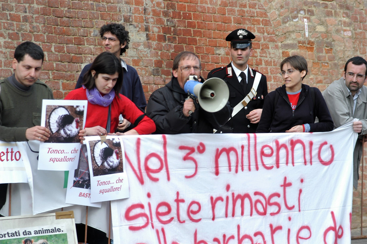 La cosa dovrebbe far ridere, e in effetti il popolo ride ed esulta, e invece a noi fa una gran pena e fa piangere il cuore. Gli animalisti sono relegati lontano dalla farsa e dal pubblico, ingabbiati anche loro dietro a delle transenne e circondati ai lati da un ingente spiegamento di forze dell'ordine, tra Digos, Polizia e Carabinieri. Riescono lo stesso a far sentire le propria protesta a voce o con il megafono, contro ogni forma di barbarie sugli animali, come questa di Tonco, giudicato paese incivile. Riescono a disturbare la festa che a questo punto non ha più tanto il sapore di "festa".