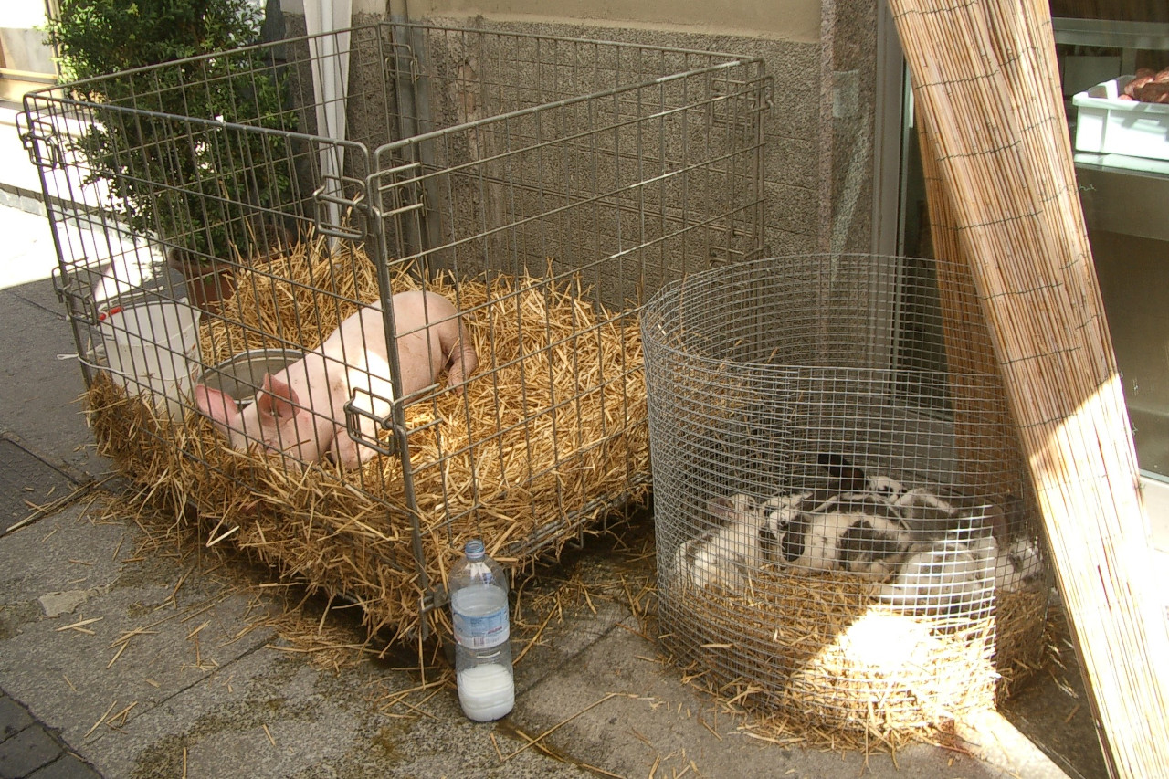 Domenica 16 maggio abbiamo partecipato alla Festa di Borgo Rovereto in Alessandria con un banchetto informativo in Via Milano ang. Via Migliara. Nel primo pomeriggio una volontaria del Gattile e una rappresentate della Lega Italiana Difesa Animali, ci segnalavano la presenza di un maiale e di alcuni conigli esposti in un recinto metallico di fronte la vetrina della macelleria "Rossini Felice" in Via Dei Guasco. Entrambe erano state insultate probabilmente dal titolare della macelleria per aver fatto notare lo stato di stress cui erano sottoposti gli animali. Uno di noi è subito andato a verificare ma è stato aggredito (per fortuna senza conseguenze) dagli stessi macellai. Ne è seguita una denuncia ai Carabinieri.