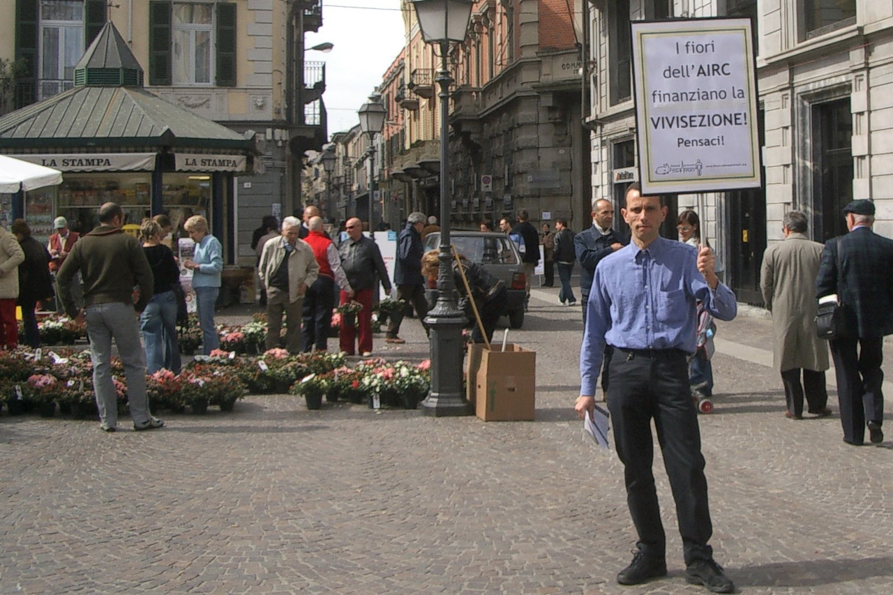 Domenica 9 maggio l'Associazione Italiana per la Ricerca sul Cancro (AIRC) raccoglieva fondi per sostenere la ricerca sul cancro attraverso la vendita delle "Azalee della ricerca" in migliaia di piazze italiane. L'AIRC continua a finanziare studi basati sul modello animale, cioè in cui si pratica la sperimentazione animale. Eravamo presenti vicino al loro gazebo in Alessandria in Piazzetta della Lega per informare la gente che comprando le azalee di AIRC si finisce con il sostenere anche la vivisezione.