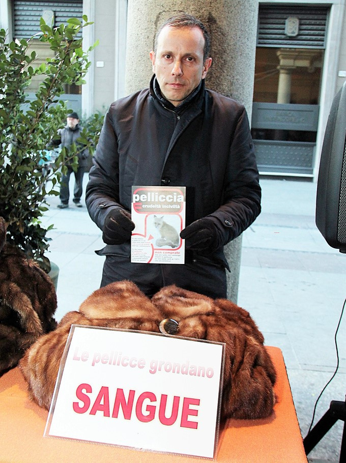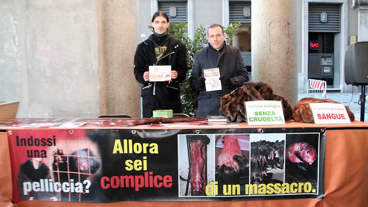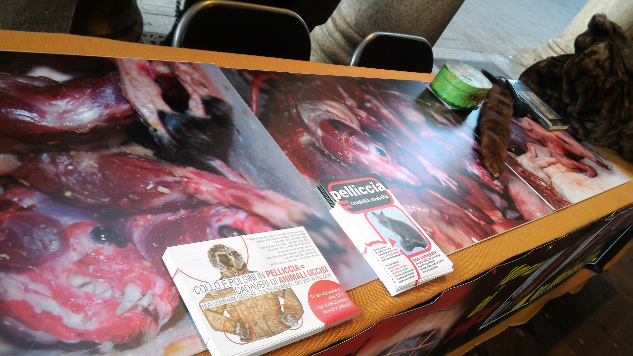 Un banchetto minimale con dei volantini e dei cartelli con le foto di ciò che resta dei procioni scuoiati vivi e coscienti: i loro corpi sanguinanti sono accatastati gli uni sugli altri e continuano ancora a muoversi tra atroci sofferenze. Poi due pellicce accostate, una ecologica, che non ha fatto male a nessuno, e una di visone per la quale sono invece stati ammazzati dai 30 ai 50 animali. Le pellicce grondano sangue, peccato che chi le indossa non voglia sapere.