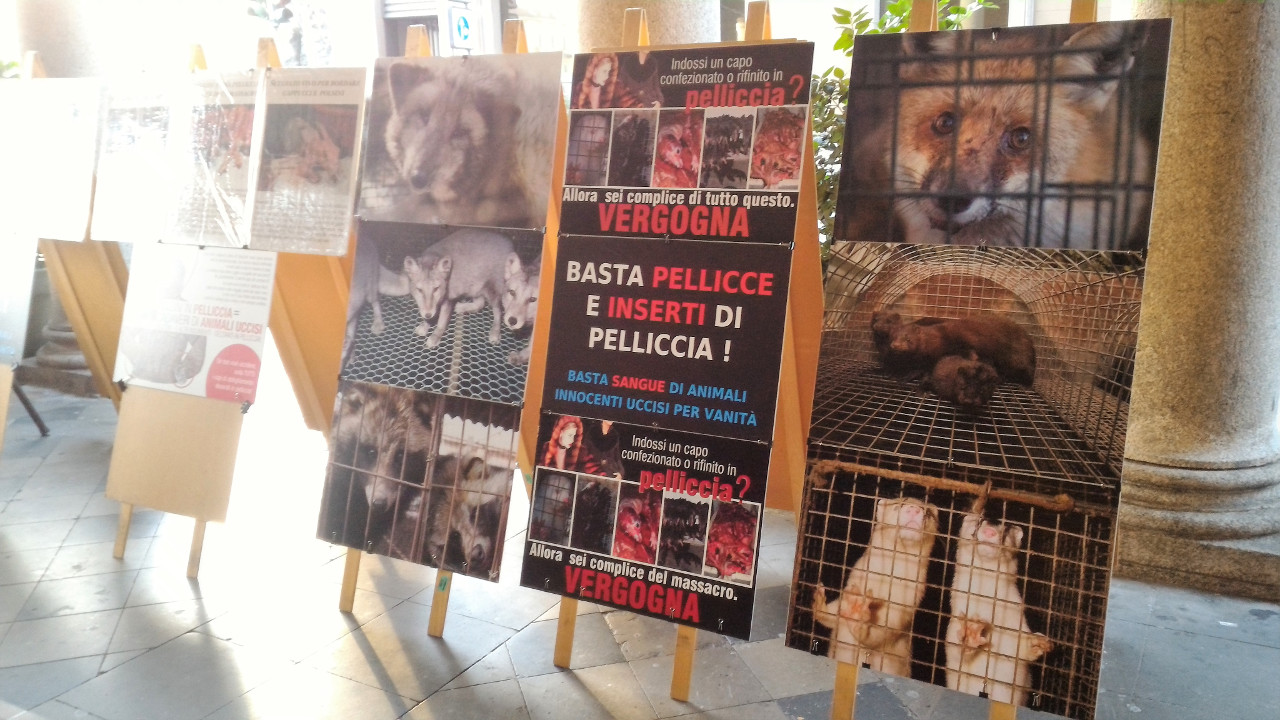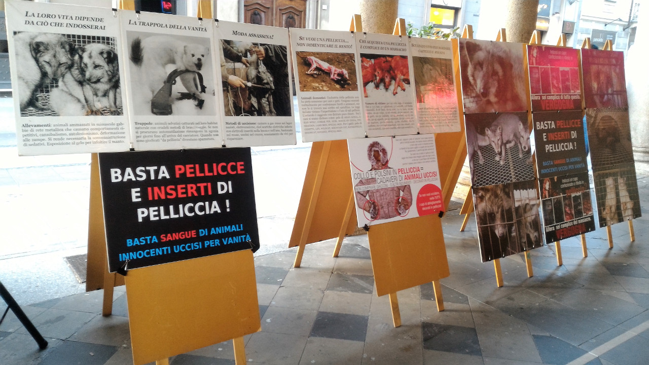 Sabato pomeriggio 20 gennaio abbiamo allestito un banchetto informativo e una mostra a pannelli fotografici per ricordare gli animali vittime della vanità, quelli catturati in natura o allevati in cattività e infine crudelmente ammazzati a randellate, con l'elettrocuzione o in camere a gas o anche scuoiati vivi, per prenderne il manto per farne pellicce o inserti che decorano i cappucci e i polsini di giubbotti e giacconi, cappelli, borse, scarpe, ecc.. L'iniziativa si è svolta ad Alessandria sotto i portici di Corso Roma.