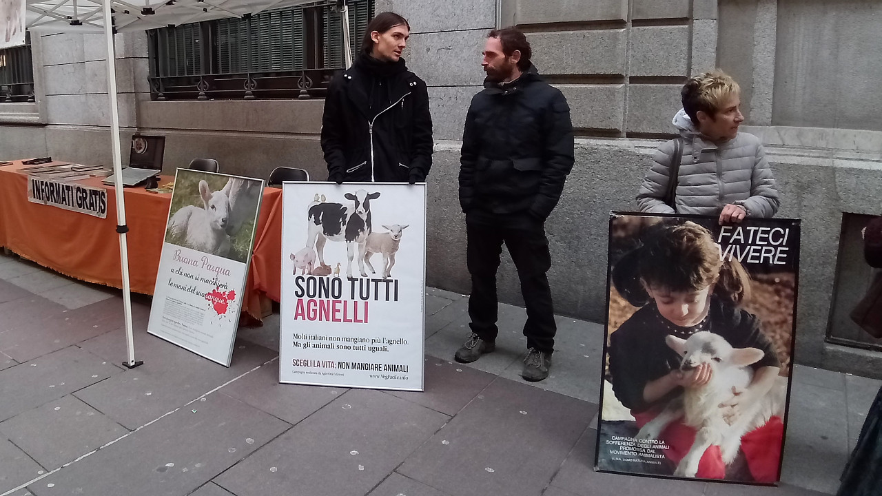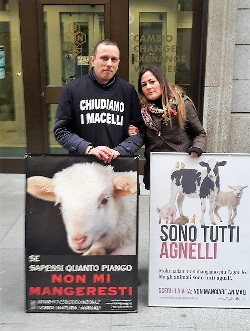La realtà dell'agnello di Pasqua è quella di cuccioli di appena venti giorni, strappati alle loro madri e caricati a forza su un camion, ammassati l'uno addosso all'altro e portati a morire in un macello, tra terrore, belati strazianti e sangue ovunque. Telecamere nascoste hanno mostrato scene di brutalità oltre ogni immaginazione: animali sgozzati senza stordimento, utilizzo di compressori d'aria per gonfiare gli agnelli, molti ancora vivi, per separare la pelle dai muscoli. Questo succede anche in Italia. A noi attivisti le urla degli animali terrorizzati ci fanno raggelare il sangue, ma la gente che passa sembra totalmente indifferente.