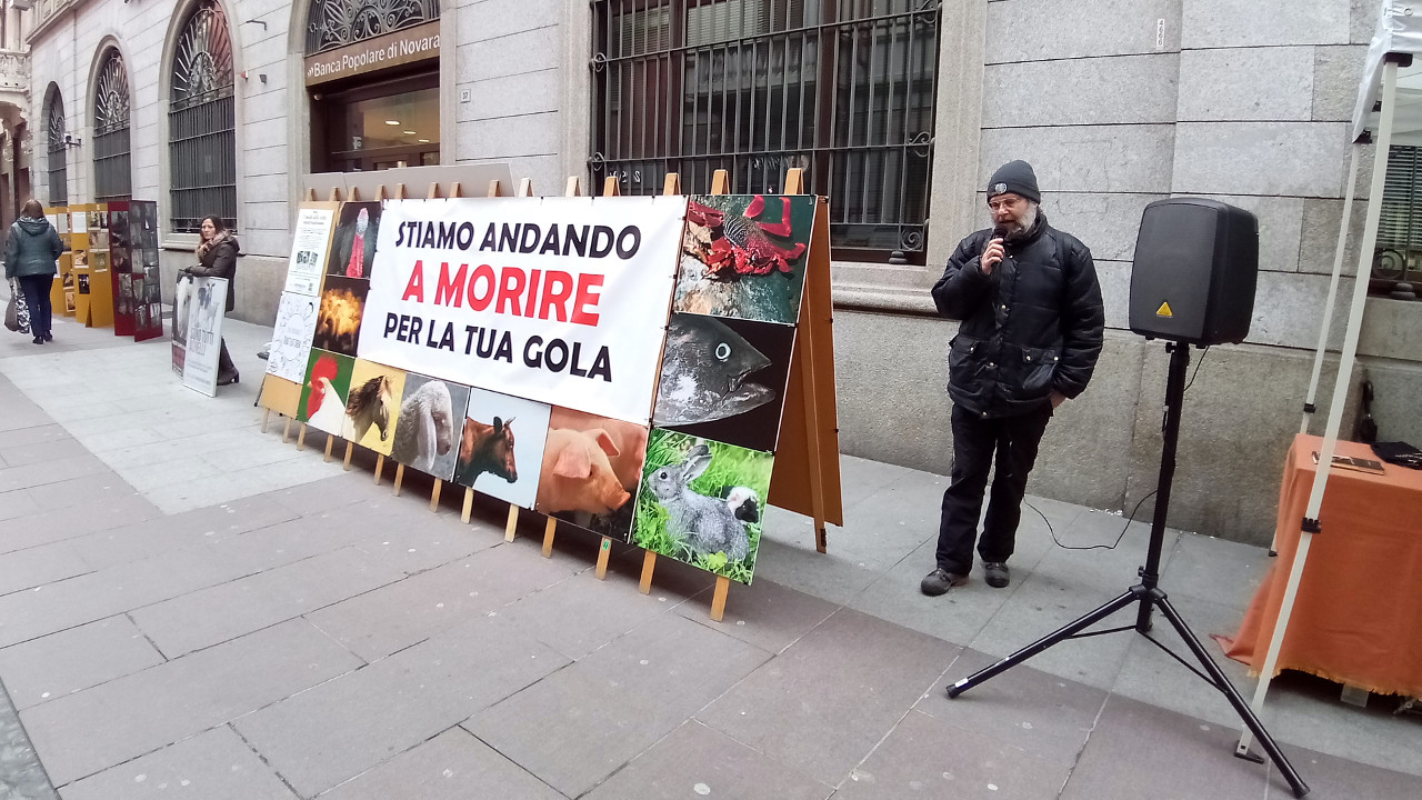 Il presidio aveva lo scopo di informare i passanti sulla vita e la morte degli animali, fatti nascere unicamente per essere ammazzati in nome di tradizioni come l'agnello a Pasqua, e in generale, sulla vita e la morte di tutti gli altri animali durante tutto l'anno, in un olocausto senza fine. Questa "vita", per gli animali, è fatta di privazioni, estrema sofferenza, terrore e sangue. Abbiamo mostrato questa realtà con una mostra fotografica, dei filmati e con degli interventi a voce. Abbiamo fatto sentire i belati degli agnelli e le voci terrorizzate degli altri animali quando incontrano il boia nel mattatoio. Di tutto questo sono responsabili in primo luogo i consumatori, tutti coloro che ancora desiderano mangiare carne, latte e uova.