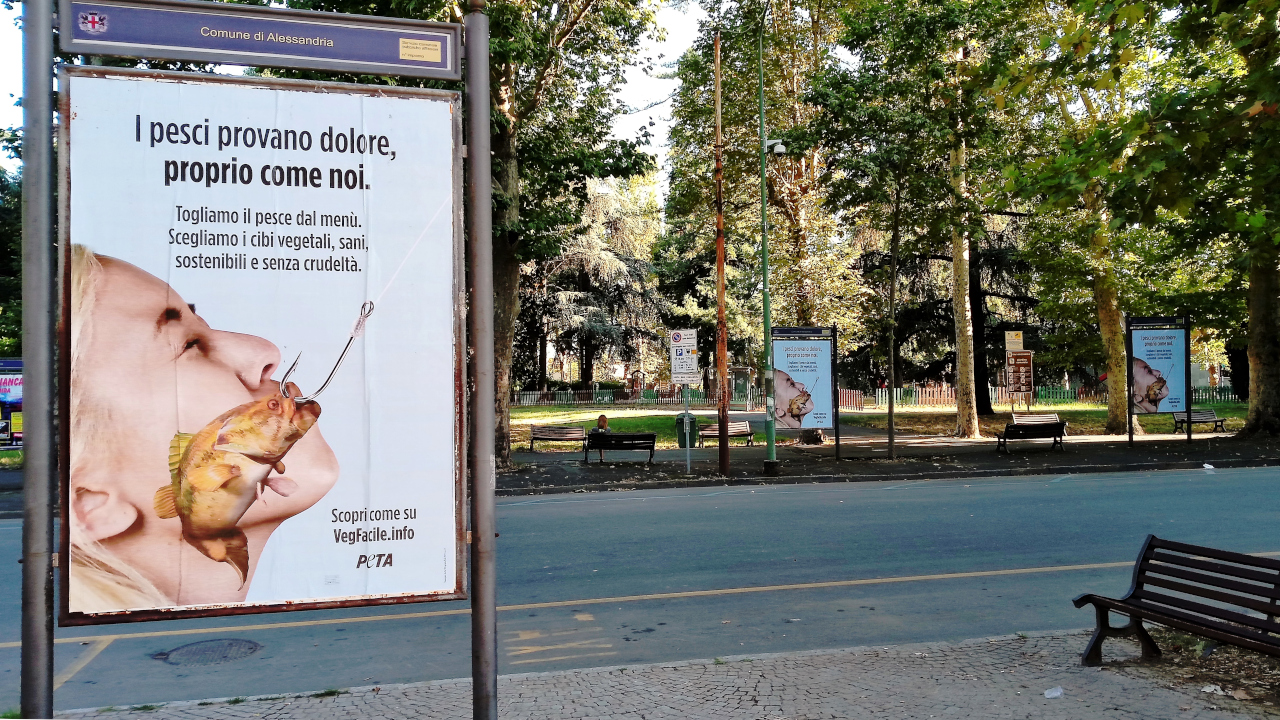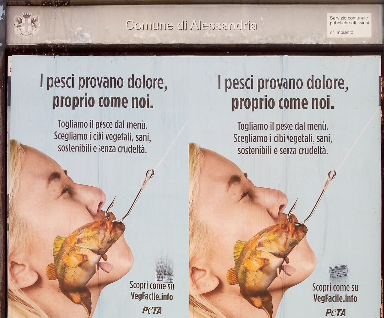 Ogni anno dedichiamo una campagna pubblicitaria a manifesti in difesa degli animali, quest'anno l'abbiamo dedicata ai pesci, gli animali più trascurati e sterminati. I pesci usati per l'alimentazione superano in numero tutti gli altri animali, mammiferi e uccelli messi insieme. Conteggiarne il numero sarebbe impossibile, vengono quantificati a peso: sono 100 milioni di tonnellate all'anno. Per dare più visibilità a questa campagna, domenica 14 luglio, in collaborazione con Animal Renegades di Torino, abbiamo organizzato una coreografia in Piazzetta della Lega in cui abbiamo rappresentato la sofferenza dei pesci.