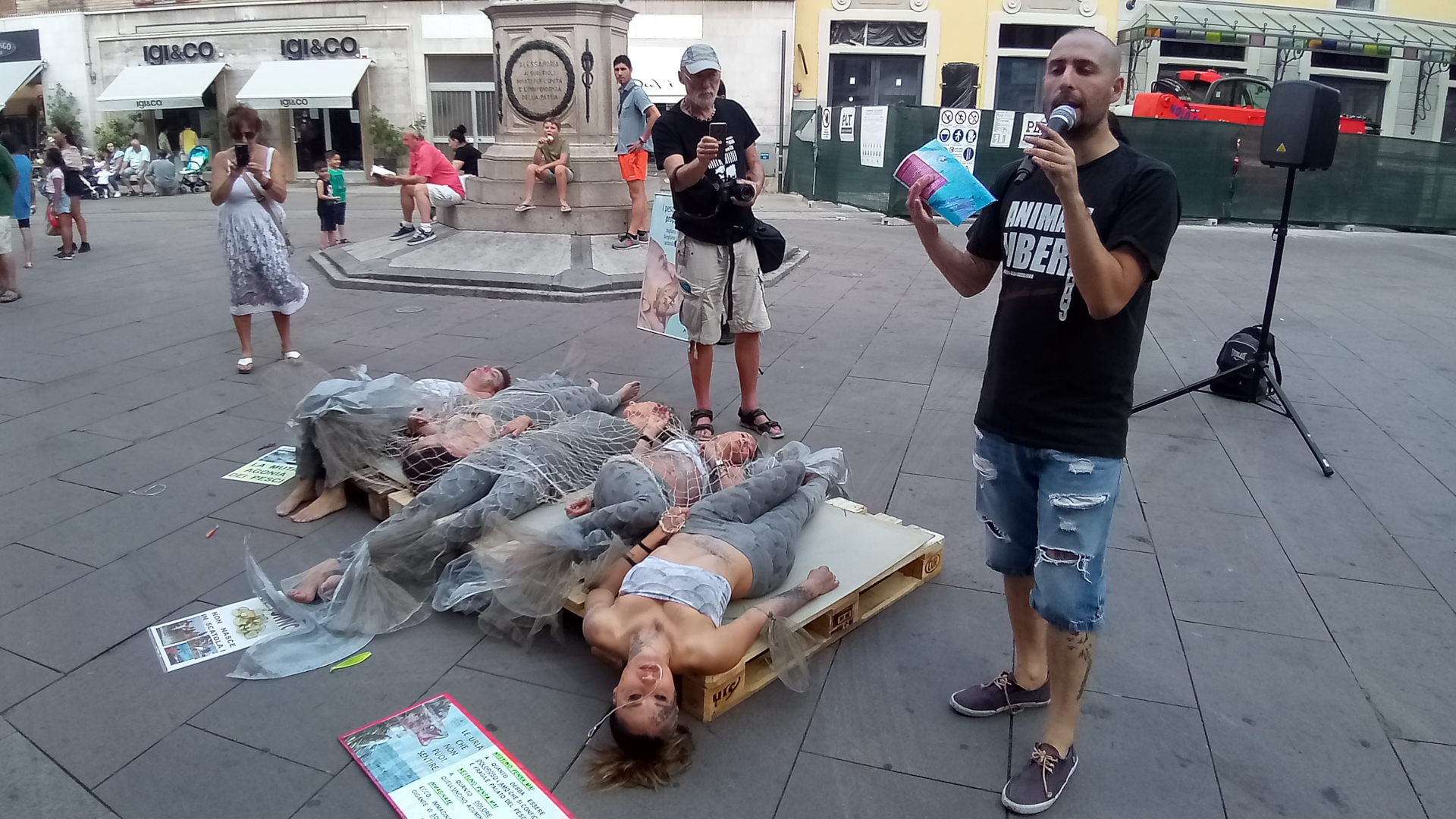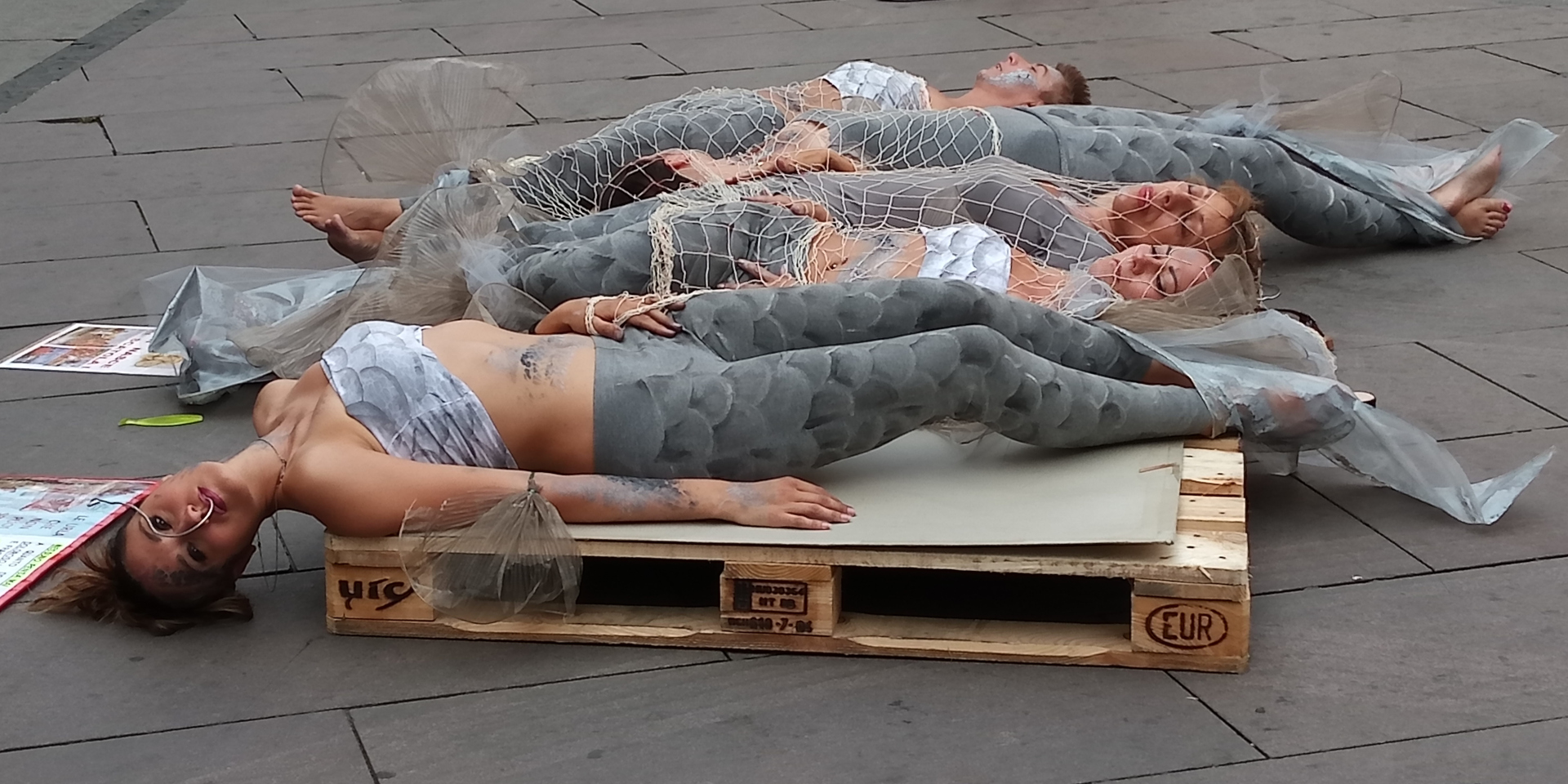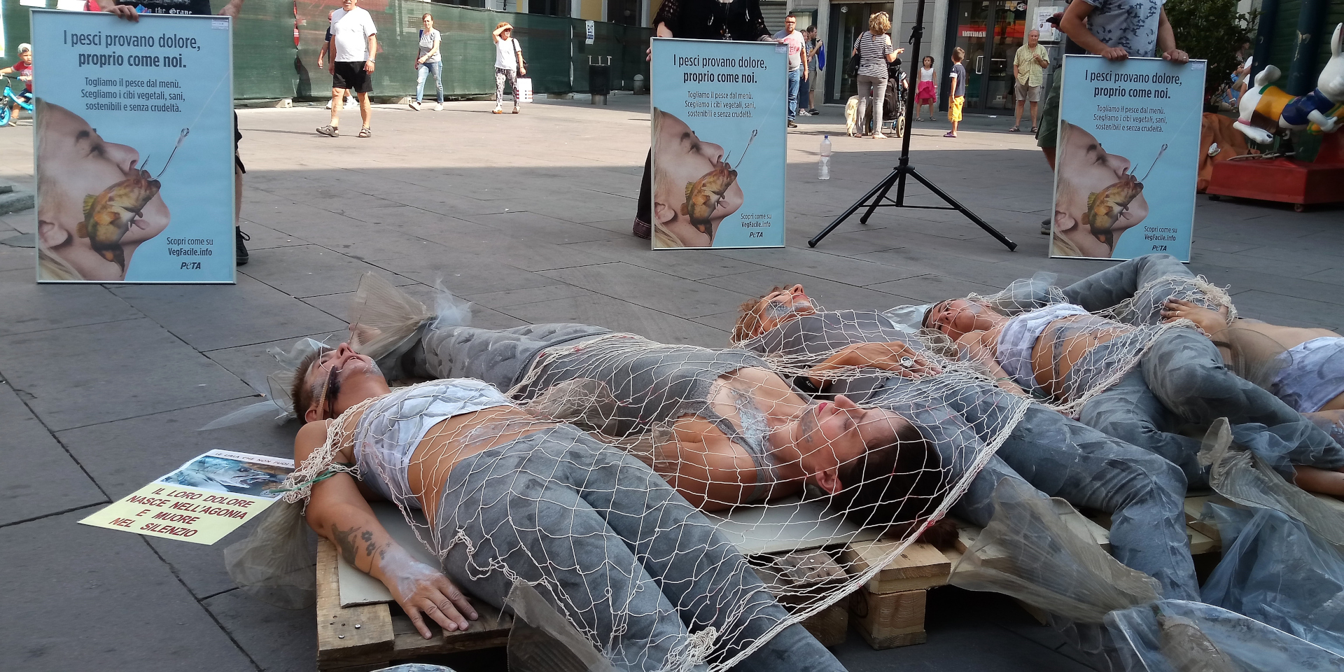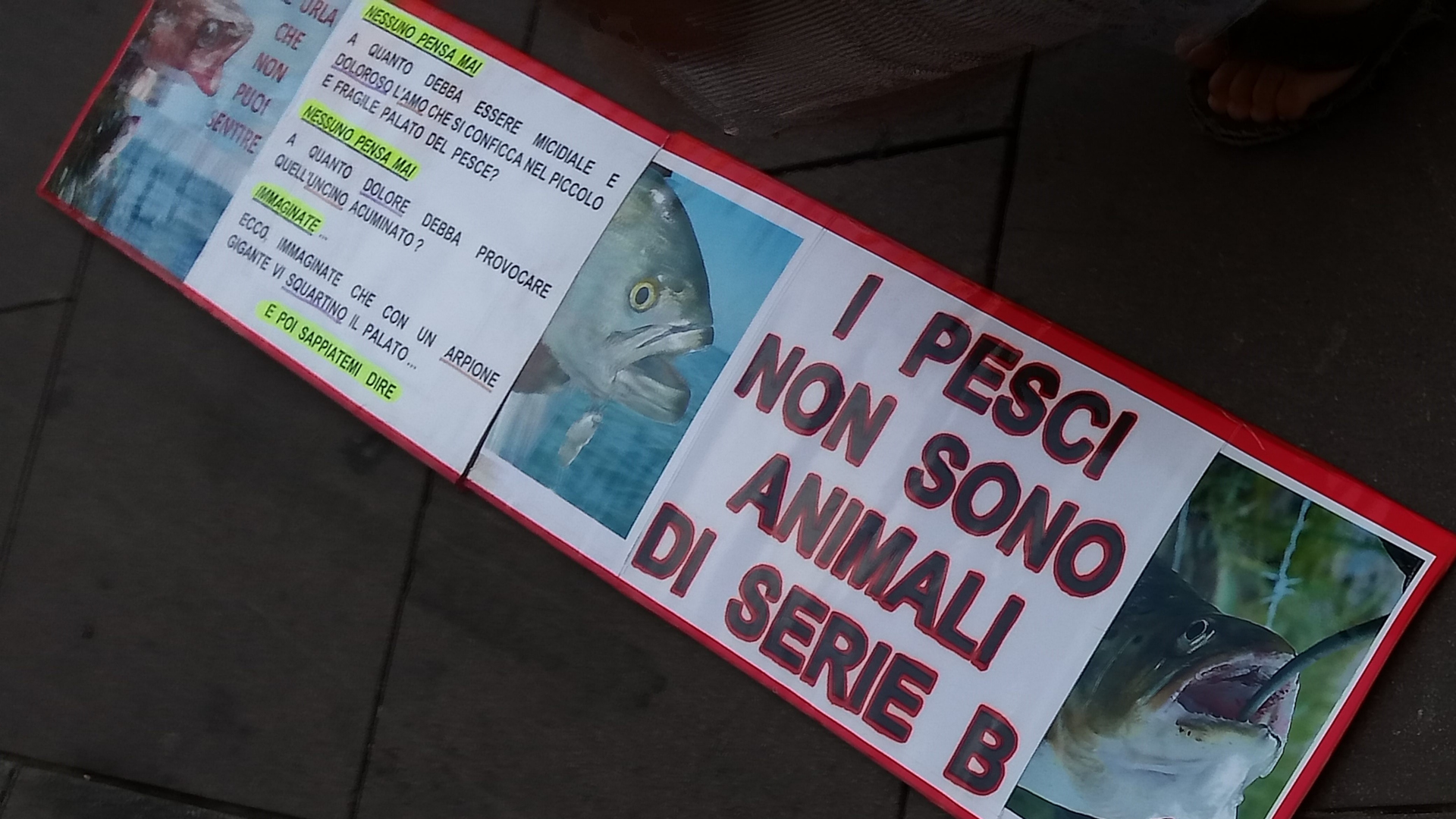 Domenica 14 luglio, dalle 16,30 alle 18,00 abbiamo organizzato una coreografia d'impatto per richiamare l'attenzione sul fatto che i mari si stanno svuotando di ogni forma di vita per via dell'ingordigia umana. Alcune figuranti truccate e in costume da pesce si sono sdraiate su dei bancali di legno, mute e immobili come i pesci, e poi ricoperte da una rete da pesca e alcune di loro con un amo in bocca. Sullo sfondo, altri volontari tenevano delle cornici con il manifesto della campagna e una voce registrata alternata a brani musicali spiegava quanto la sofferenza degli esseri acquatici sia identica a quella di qualunque altro animale.
