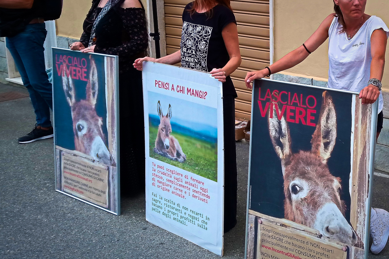 Lo abbiamo già detto e scritto innumerevoli volte, e continuiamo a farlo: ogni estate è una esplosione di sagre e abbuffate di carne senza ritegno in ogni dove, e di nuovo, quest'anno abbiamo manifestato in due date, il 16 e il 18 agosto, il nostro dissenso davanti l'ingresso della sagra dei salamini d'asino di Castelferro, presa ormai a simbolo di tutte le sagre a base di animali ammazzati della provincia di Alessandria, quest'anno giunta alla 44° edizione.