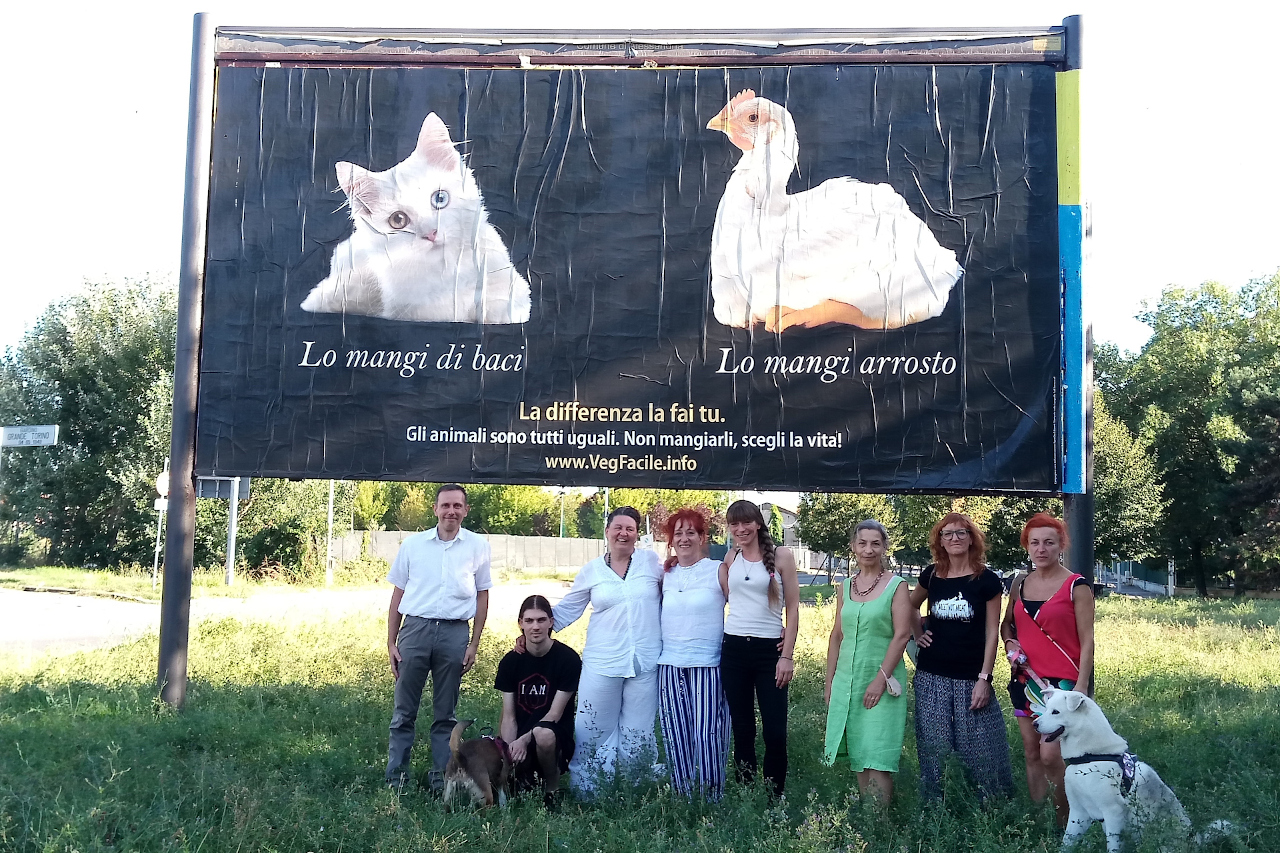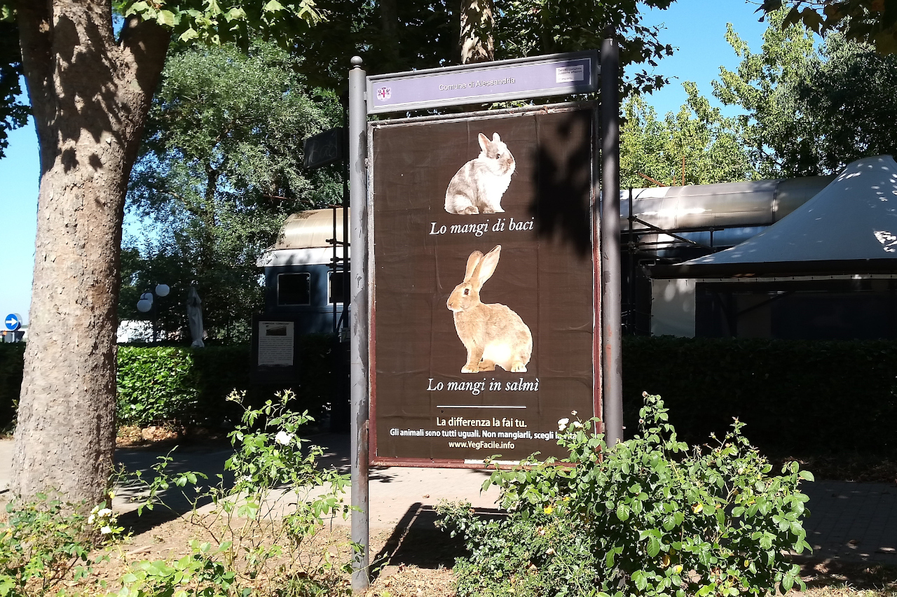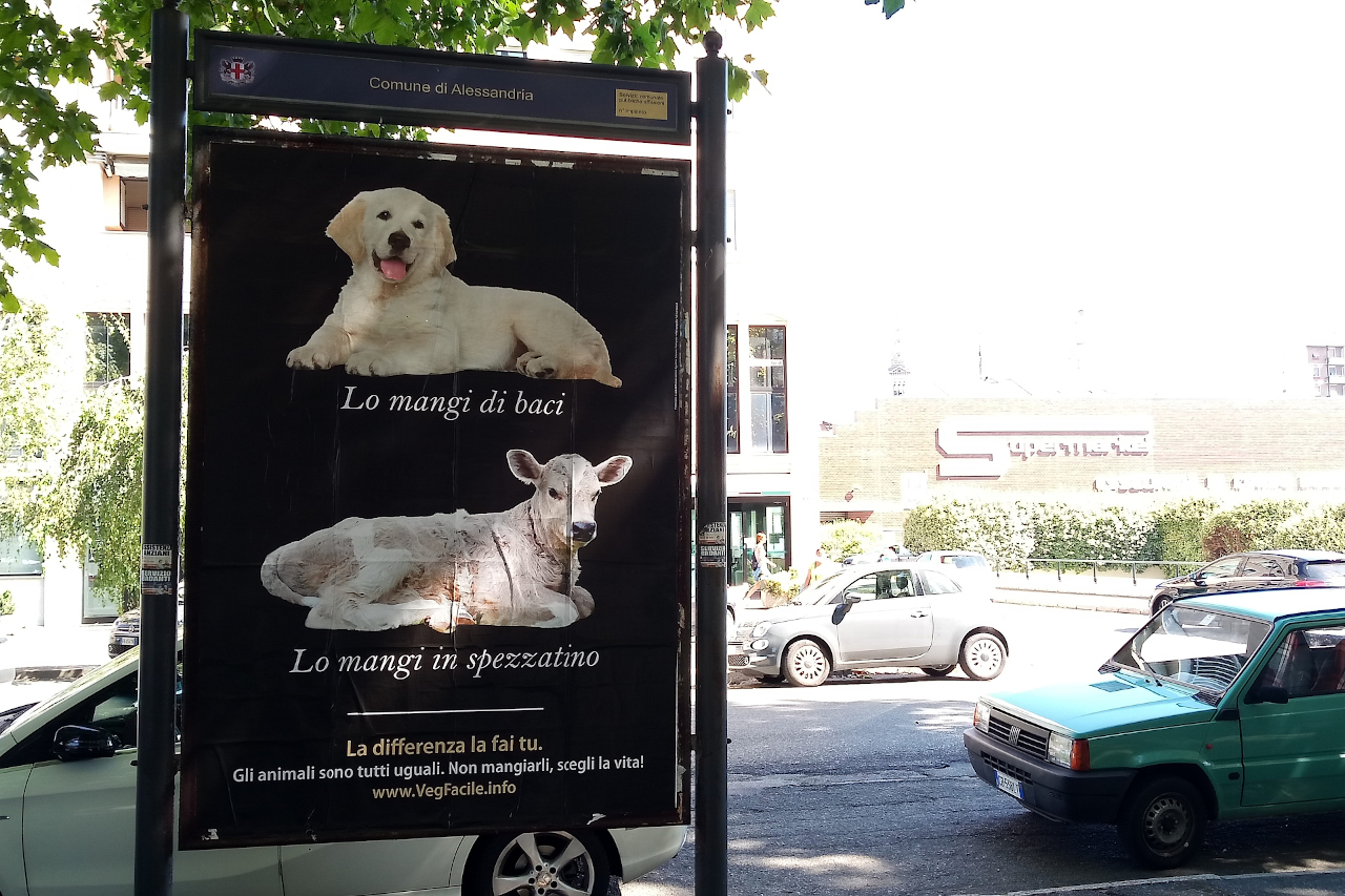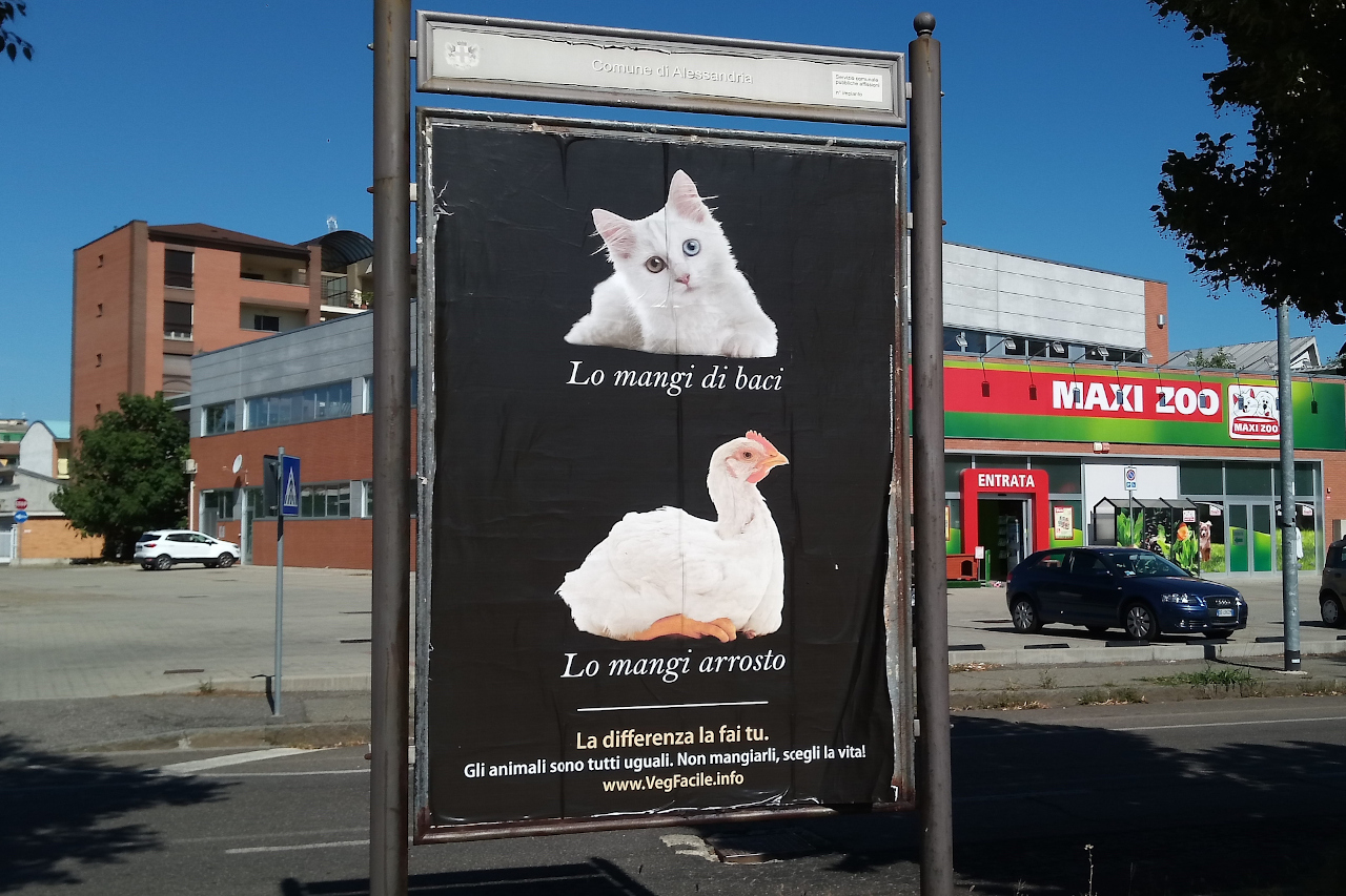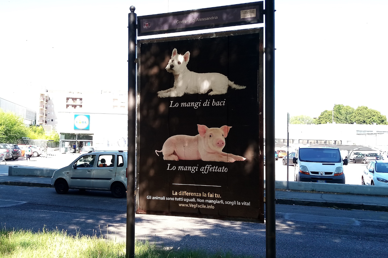 Nuova campagna pubblicitaria a manifesti in Alessandria, mentre non sono ancora stati del tutto coperti i manifesti delle precedenti altre due campagne, quella sulla fine dei pulcini maschi e quella in difesa di polli e galline, di cui qualche manifesto resiste ancora! La nuova campagna s'intitola "Lo mangi di baci" e intende evidenziare la contraddizione tra l'amare alcuni animali, quelli cosiddetti "d'affezione" e mangiarne invece altri, quelli d'allevamento destinati al consumo umano. Ma gli animali sono tutti uguali e la differenza "la fai tu".
