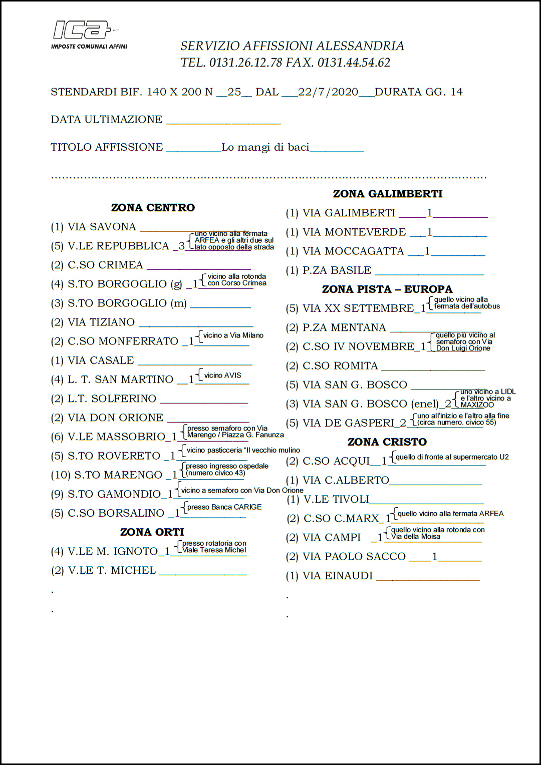 L'affissione è iniziata il 22 luglio, per 14 giorni e consta di 25 stendardi bifacciali da 140x200 cm e un poster da 6 metri x 3. Ringraziamo tutte le persone che con una donazione hanno sostenuto le spese di affissione: Bianca S. e Enzo A., Cristina G., Deana B., Elisa P., Giancarla M., Giuseppina G., Lorena R., Luisa B. A., Mario C., Marzia S., Massimo S., Patrizia V., Raffaella Z., Taiga A. e l'associazione AgireOra Edizioni che ha anche fornito gratuitamente i manifesti. La spesa complessiva per l'affissione è stata di 570 euro.