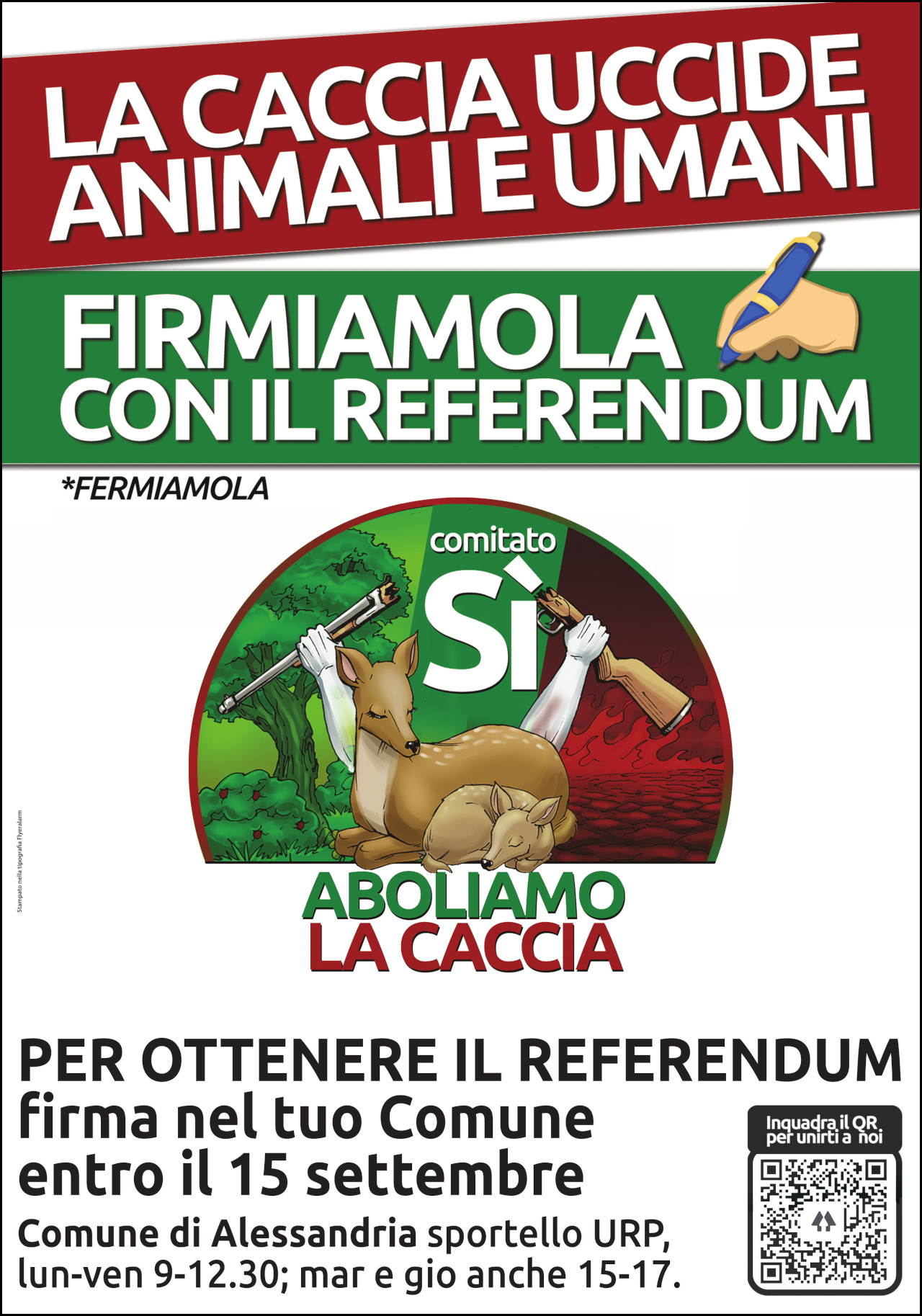 È importante far conoscere questa iniziativa referendaria anche a chi non è sui social e a chi è contrario alla caccia anche senza essere animalista dato che ogni anno sono decine le persone o i loro animali a essere vittime della caccia. Per farlo vorremmo effettuare una campagna pubblicitaria in Alessandria e sobborghi, ma ci serve un aiuto per sostenere le spese di stampa e affissione dei manifesti.
