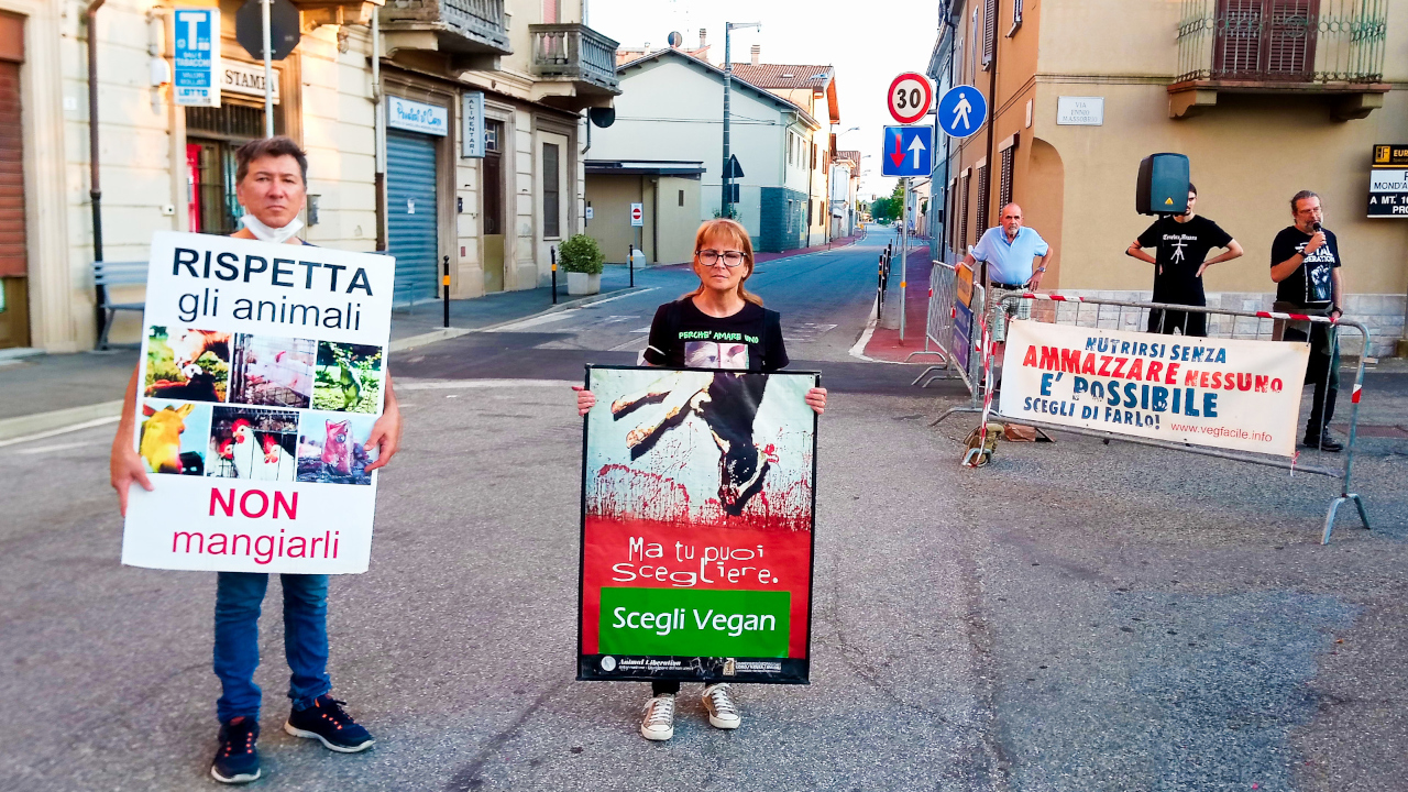 Un presidio contro le sagre che ancora promuovono il consumo di carne si è svolto sabato 21 agosto a Borgoratto Alessandrino dove era in corso la quarta sagra della fassona.