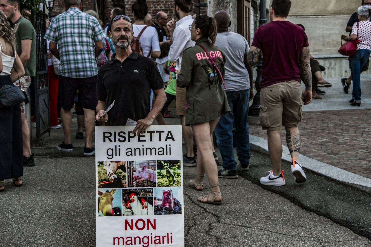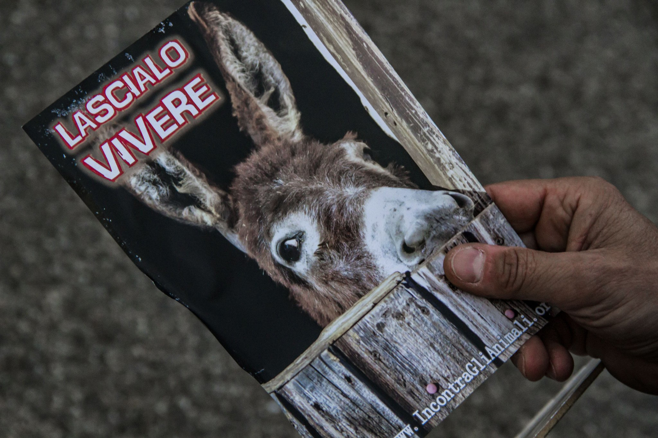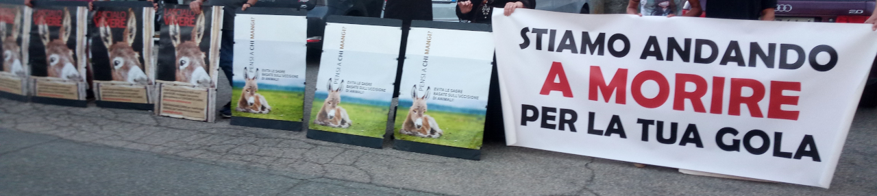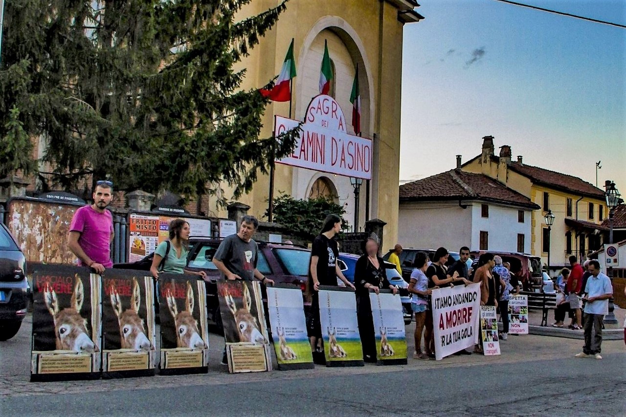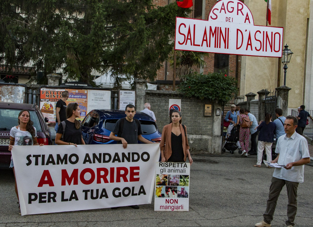Dopo la chiusura forzata per due anni per via della pandemia di COVID-19, quest'anno è tornata la sagra dei salamini d'asino, 45° edizione, a Castelferro di Predosa (AL). Sabato 20 agosto si è svolta una manifestazione statica da parte di una dozzina di attivisti muniti di cartelli e uno striscione vicino all'ingresso della sagra per esprimere dissenso contro la promozione del consumo di carne perpetrato dalle sagre come questa e al contempo per testimoniare che ci si può nutrire benissimo senza far del male a nessuno.