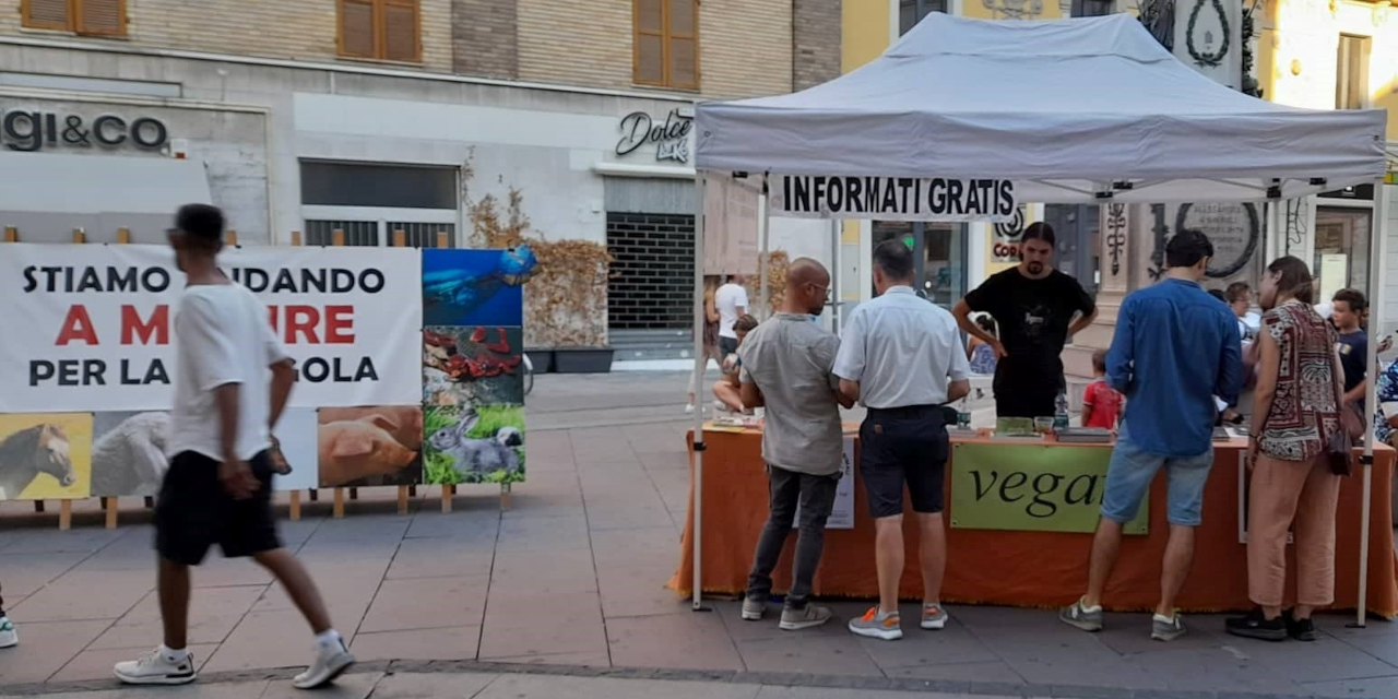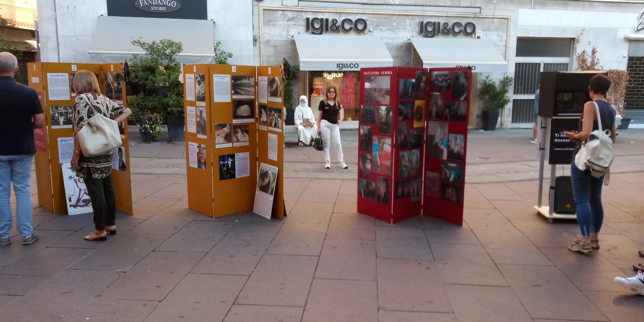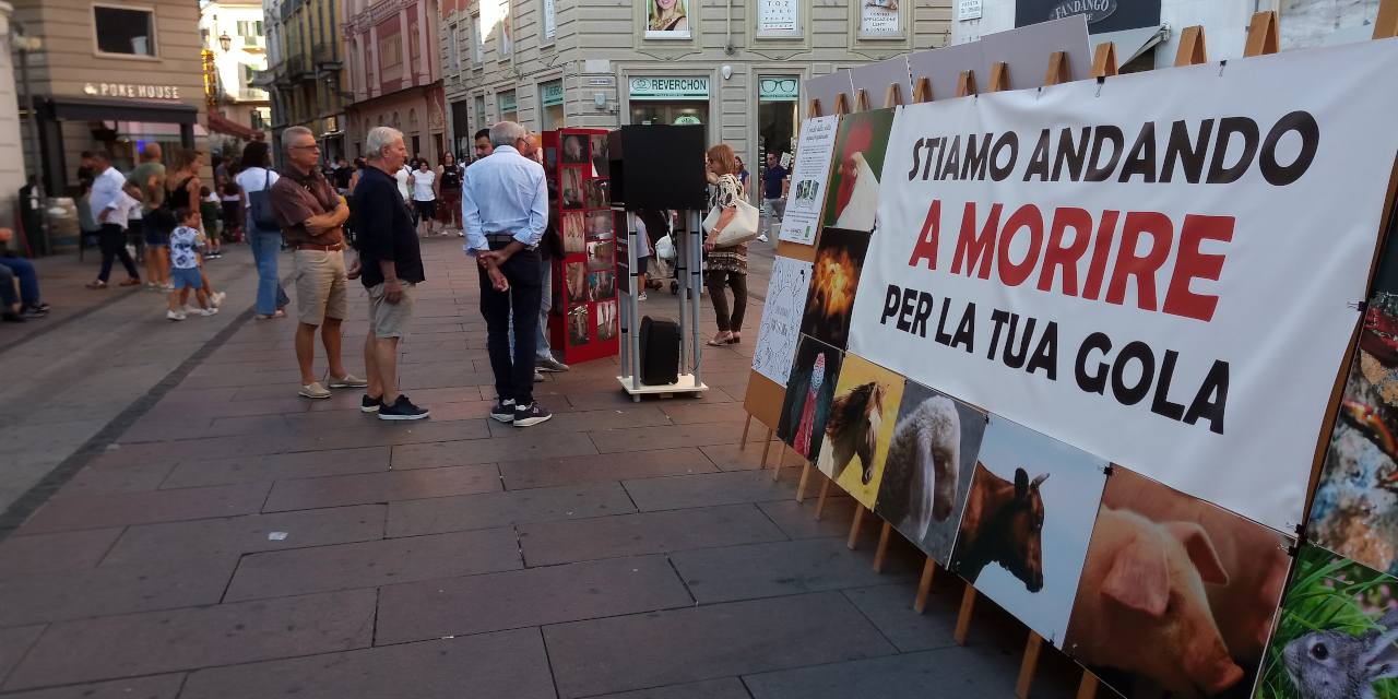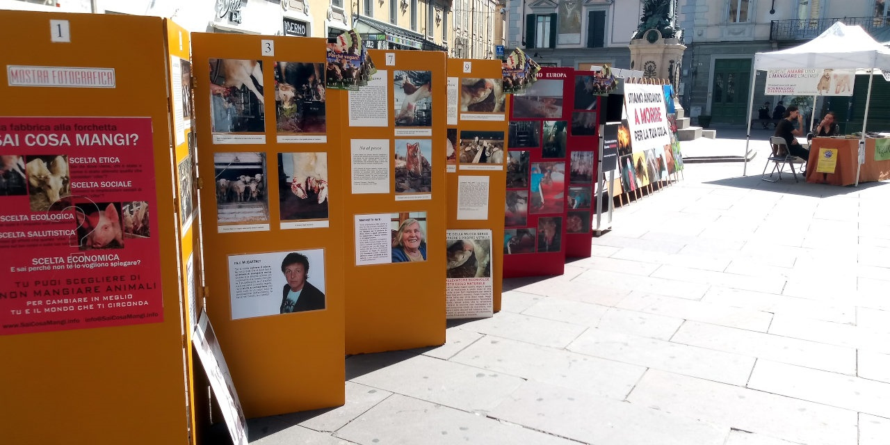 Domenica 4 settembre abbiamo esposto per tutto il giorno la mostra sulla scelta vegan nella piazzetta centrale di Alessandria, Piazzetta della Lega, dopo una sospensione di oltre un anno. La mostra ha riscosso un discreto successo e molte persone l'hanno visitata. Nel pomeriggio abbiamo aggiunto alla componente statica costituita da pannelli anche una postazione video dove a rotazione scorrevano diversi filmati sullo sfruttamento degli animali da parte dell'industria della carne, della pesca, del latte e delle uova.