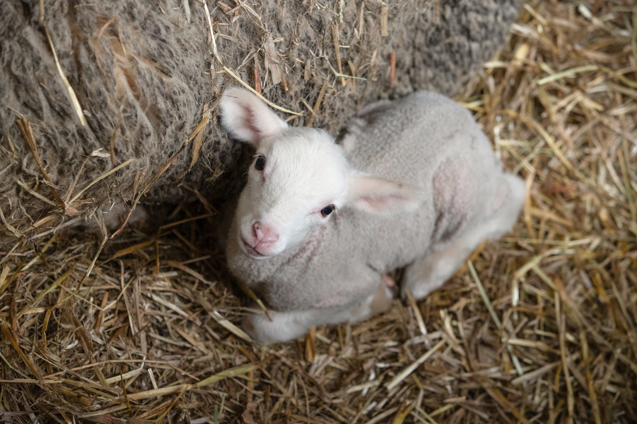 Un agnellino appena nato guarda in alto verso la fotocamera. Se è maschio, verrà macellato per la carne in giovane età. Se femmina, verrà allevato per la produzione di lana e per la futura riproduzione. Crediti: Polonia, 2019. Andrew Skowron / We Animals
