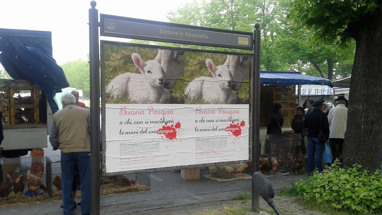 AgireOra Alessandria, torna anche quest'anno a proporre una campagna pubblicitaria a manifesti per sensibilizzare le persone contro la strage degli agnelli. I manifesti, realizzati da AgireOra Edizioni e messi a disposizione gratuitamente a chiunque ne facesse richiesta per fare un'affissione nella propria città, raffigurano un agnellino e la sua mamma e la scritta "Buona Pasqua a chi non si macchierà le mani del suo sangue".