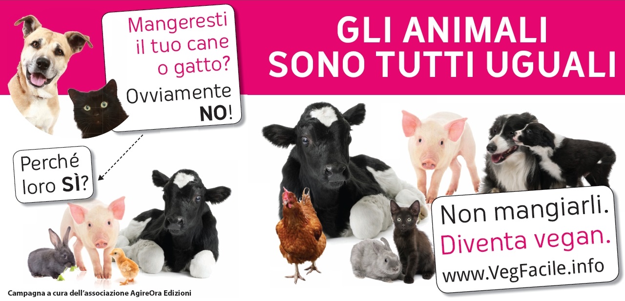 La terza iniziativa, sempre sulla scelta vegan, riguarda una campagna informativa a manifesti che vedremo in città da oggi fino a fine mese, con lo slogan "Gli animali sono tutti uguali". Vengono mostrate le foto di cani e gatti, animali d'affezione, accanto alle foto di pulcini, maiali, vitelli, polli e conigli, animali che anziché essere considerati "da amare", come i primi, sono considerati "da mangiare". La campagna intende sensibilizzare sul fatto che gli animali sono esseri senzienti capaci di provare emozioni e sentimenti e sotto questo punto di vista non ci sono differenze.